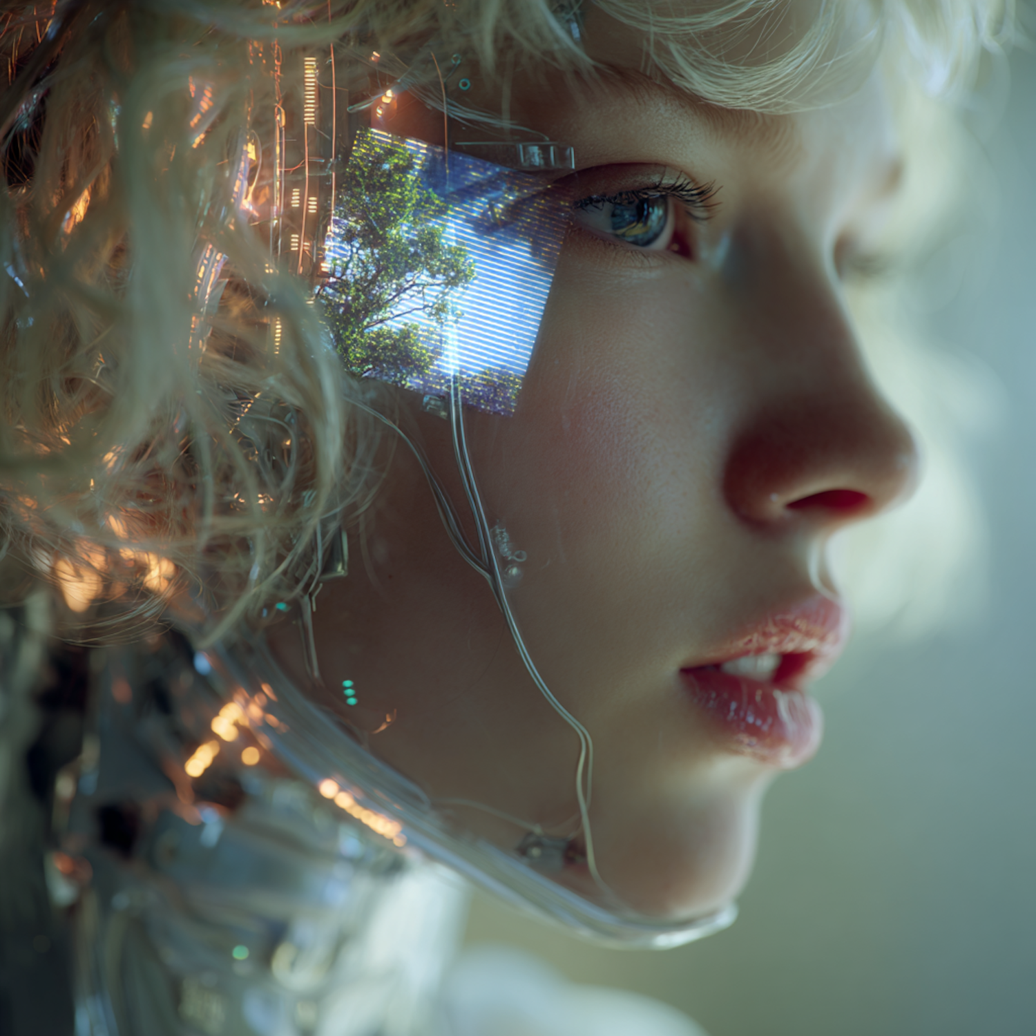 A futuristic humanoid with cybernetic features and a screen displaying nature, blending human and robotic elements in a close-up view.