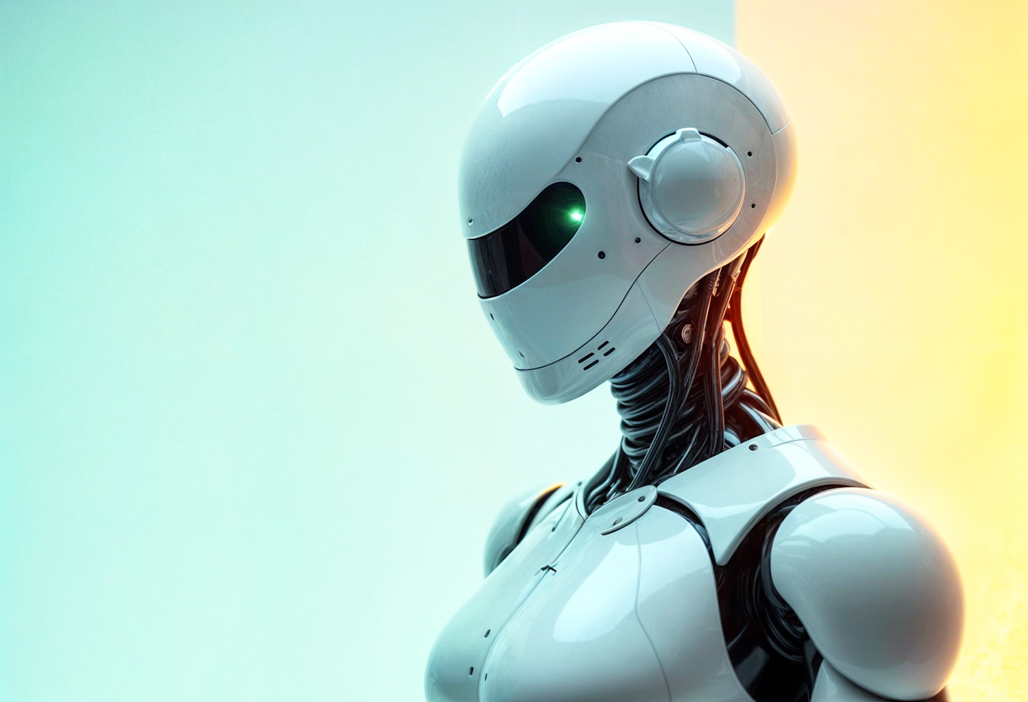 A futuristic humanoid robot with a sleek white design and glowing green eye against a gradient teal and orange background.
