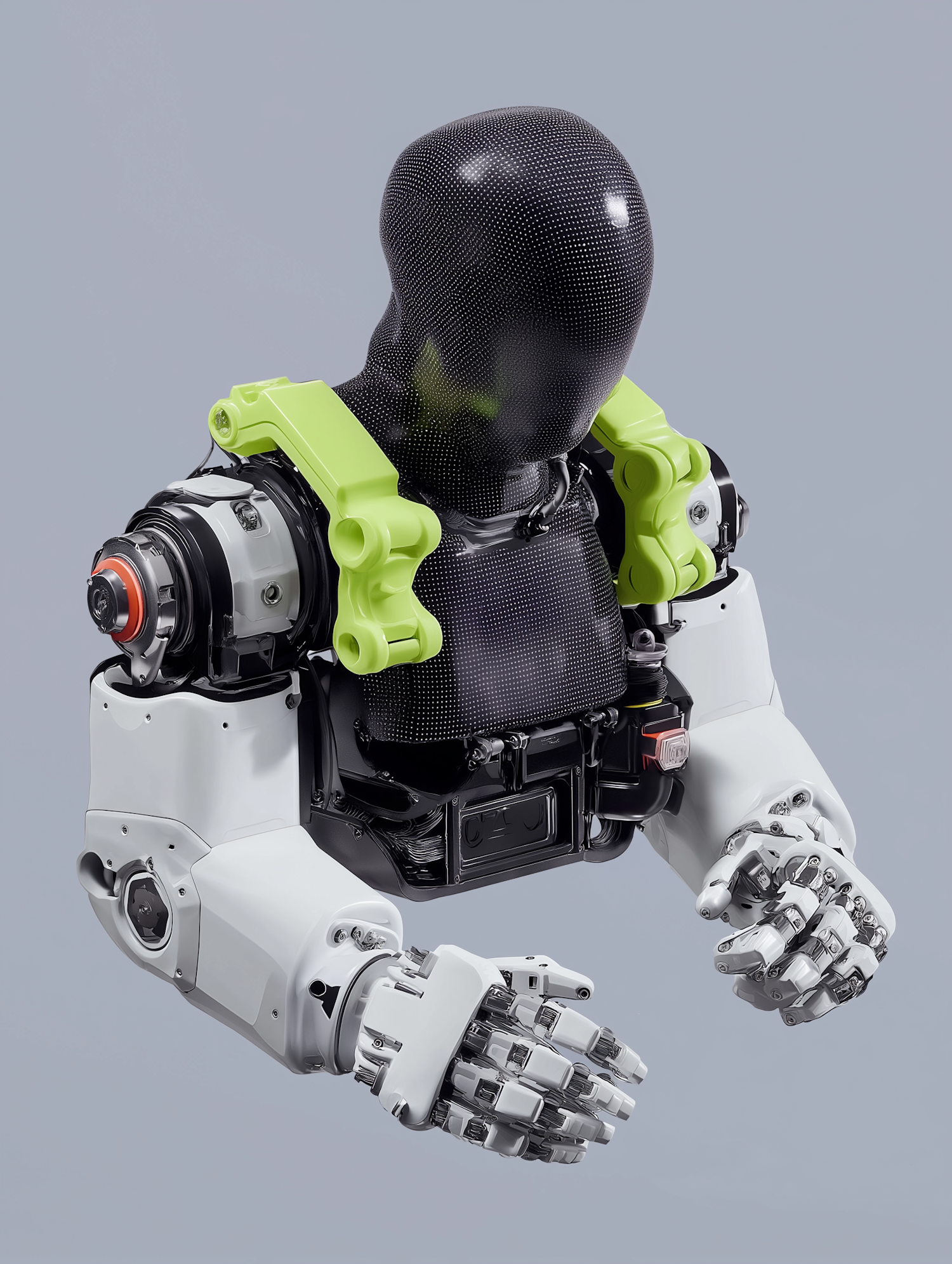 Futuristic humanoid robot with a sleek design, featuring articulated hands, a black textured head, and bright green shoulder accents.