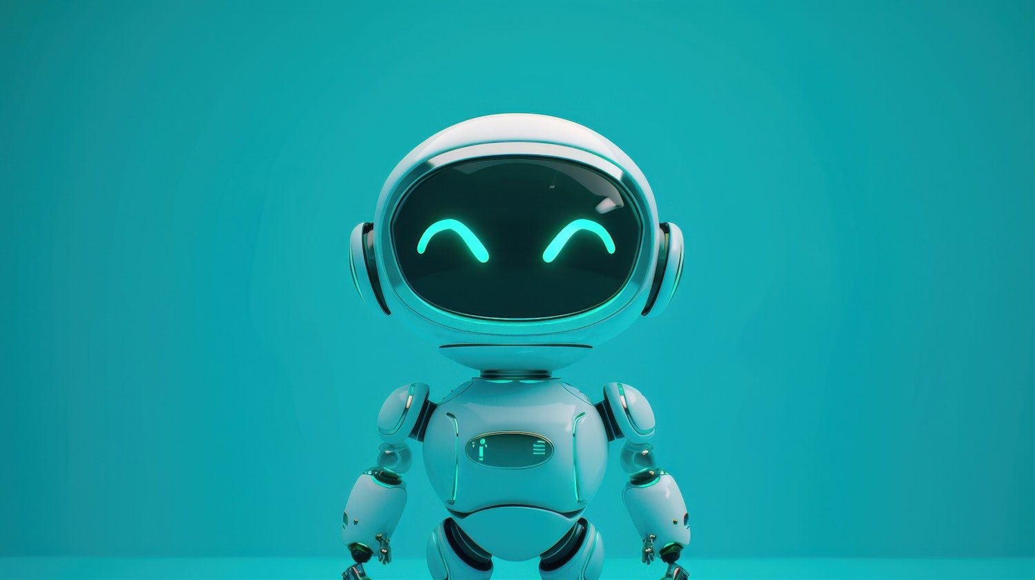 Adorable futuristic robot with glowing teal eyes on a sleek, rounded body against a vibrant teal background.