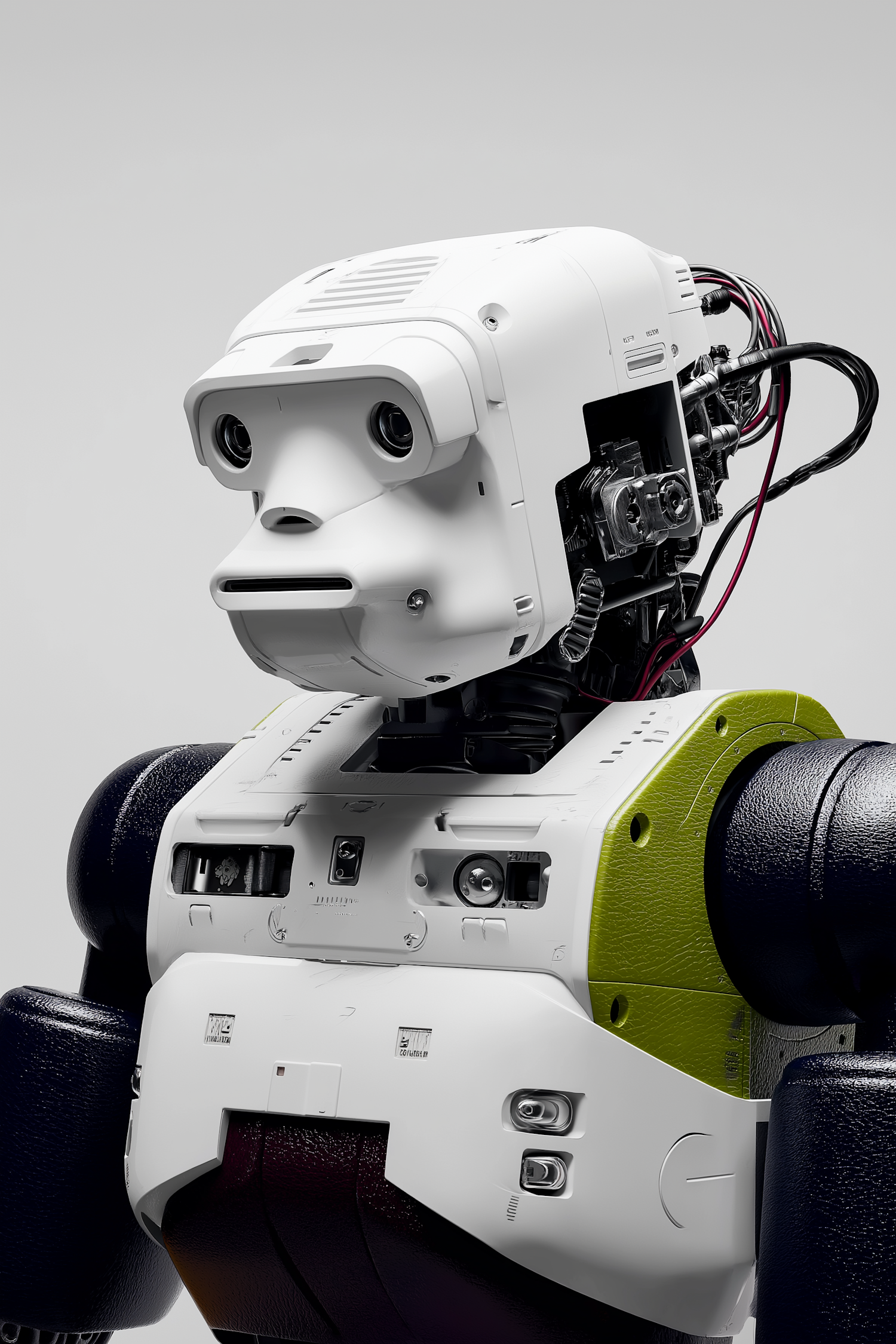 A futuristic humanoid robot with a white head, green accents, and visible mechanical details, set against a plain gray background.
