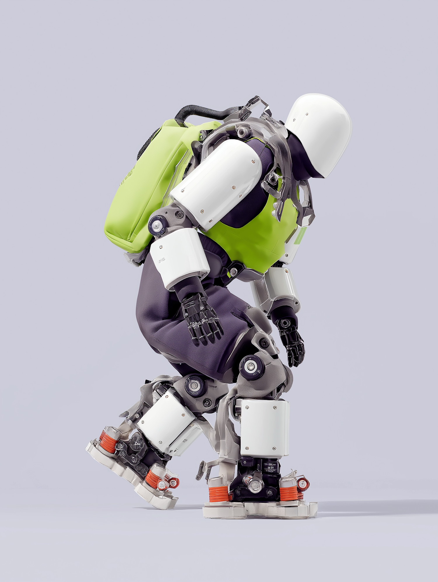 Futuristic humanoid robot with a green backpack and intricate mechanical details, walking against a light gray background.