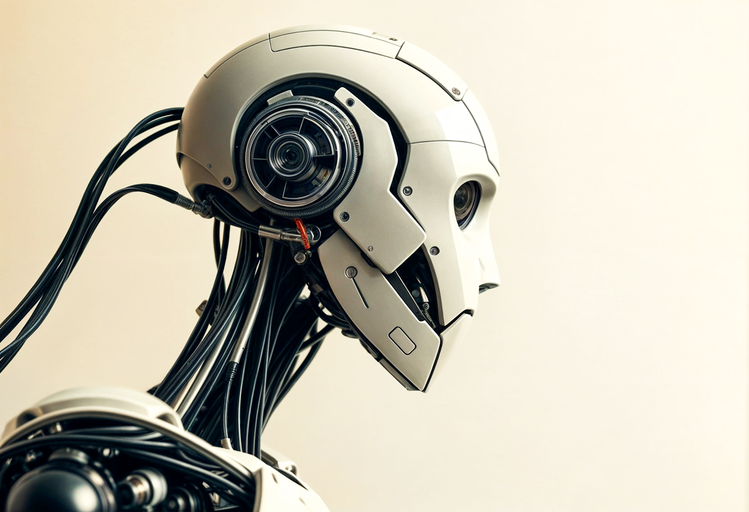 A sleek humanoid robot with a white metallic head and exposed wiring, showcasing advanced technology against a neutral background.