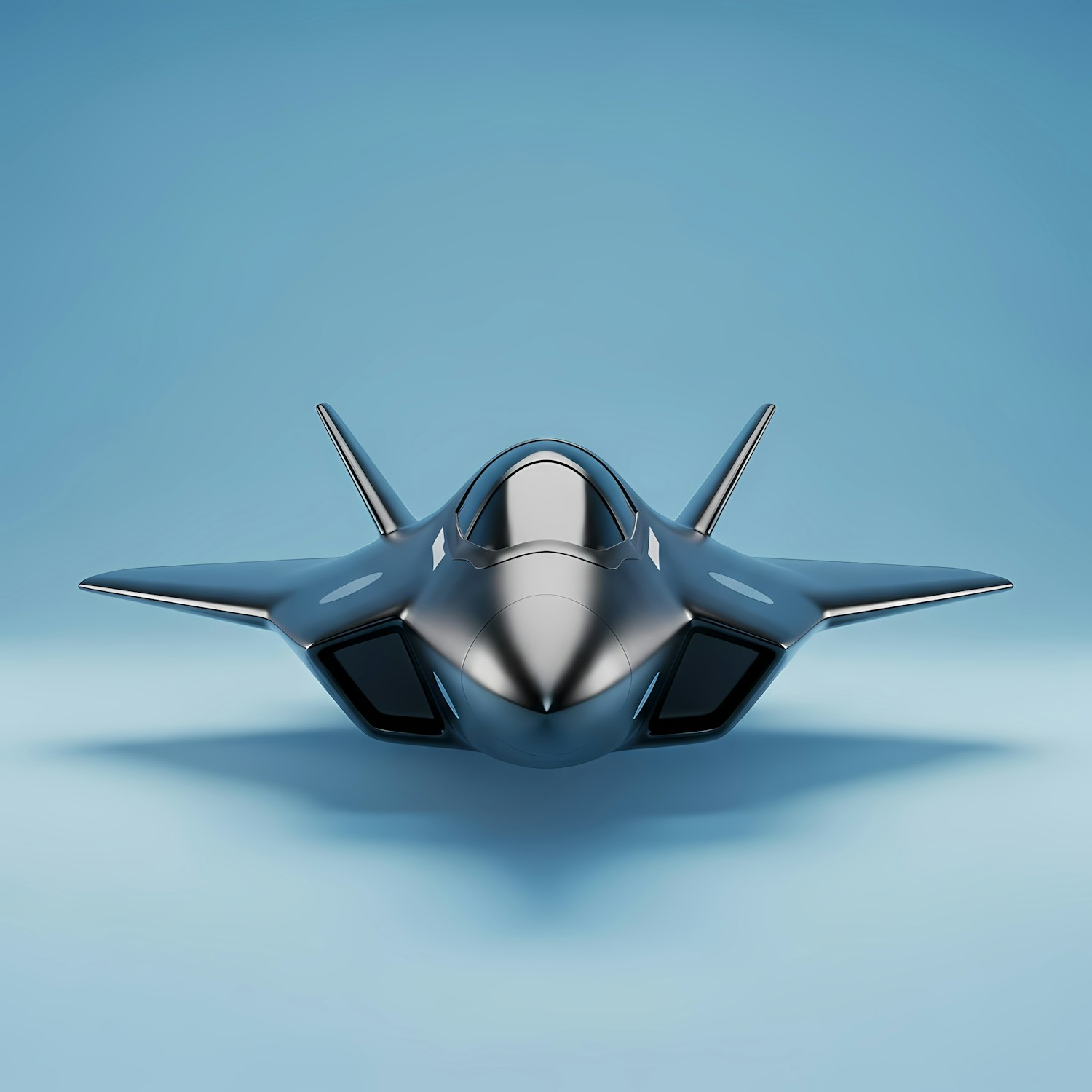 Futuristic black jet aircraft with a sleek design, rendered in 3D against a light blue background. Perfect for aviation enthusiasts.