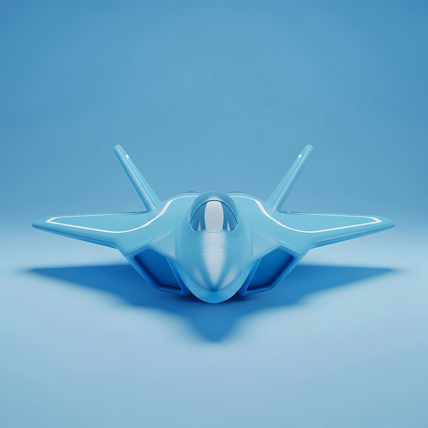 A sleek 3D-rendered futuristic jet in a vibrant blue color, showcasing a modern and aerodynamic design against a matching blue background.