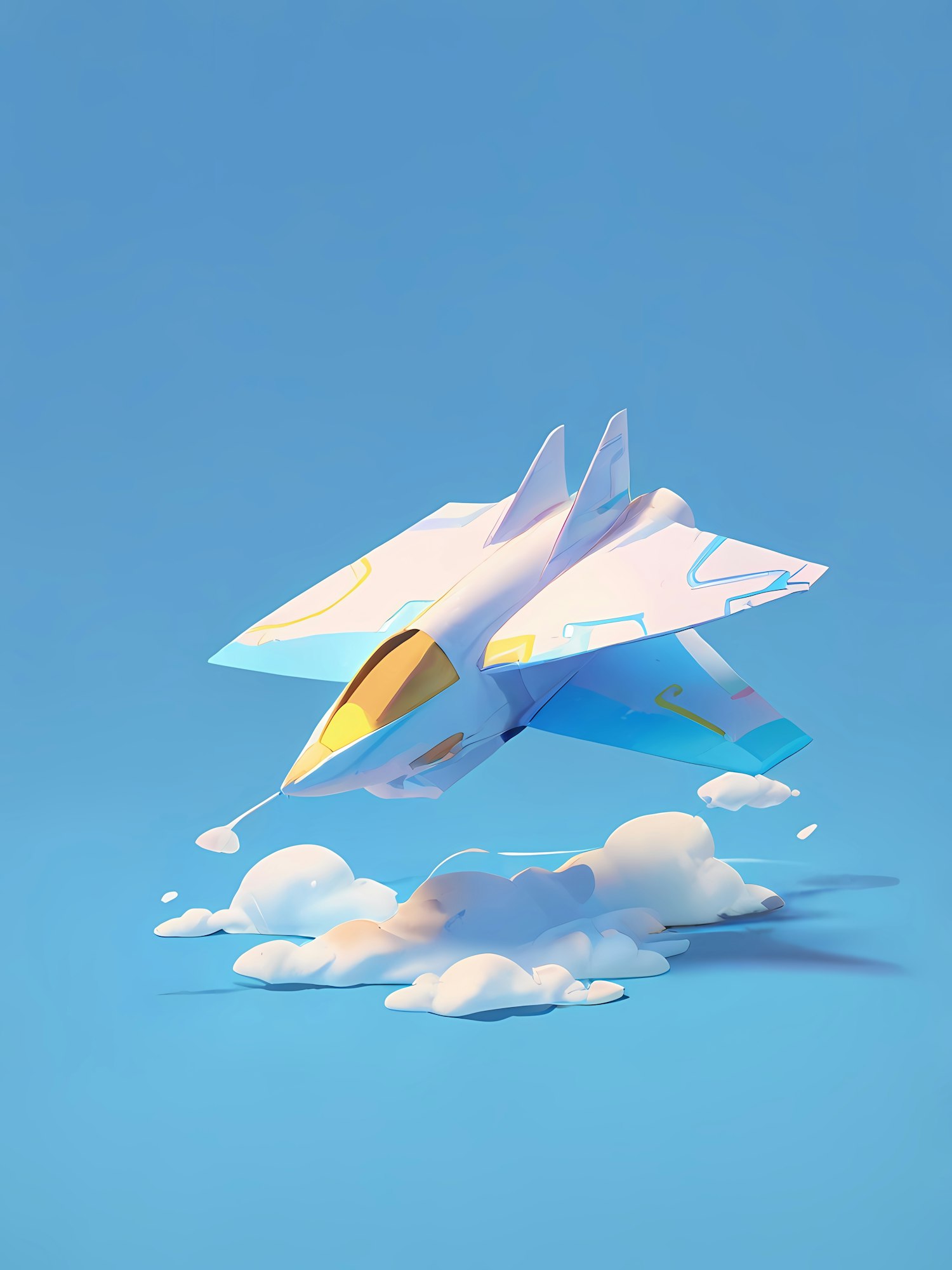 Futuristic jet illustration with sleek design, white and blue tones, golden cockpit, and fluffy clouds in a vibrant blue sky.