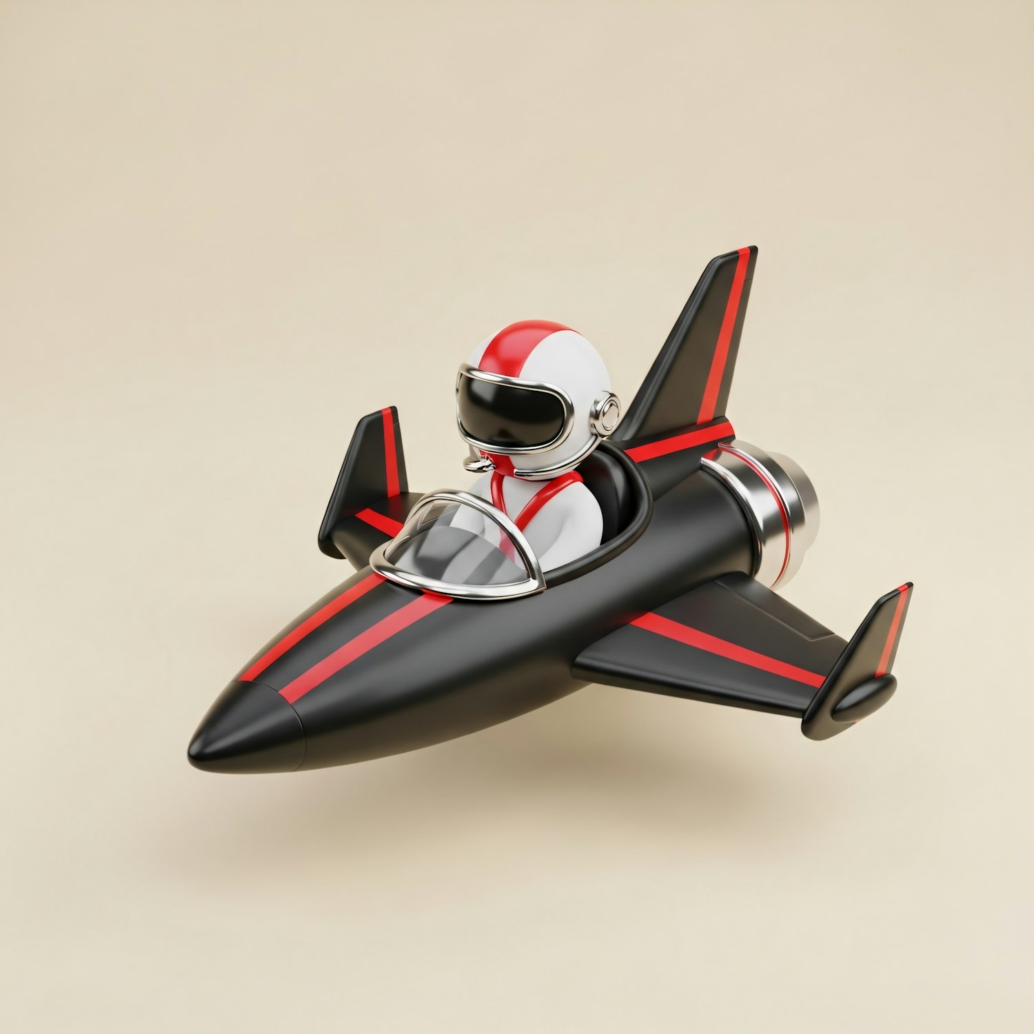 A 3D illustration of a sleek black and red jet piloted by a cartoon figure in a white and red helmet, set against a neutral background.