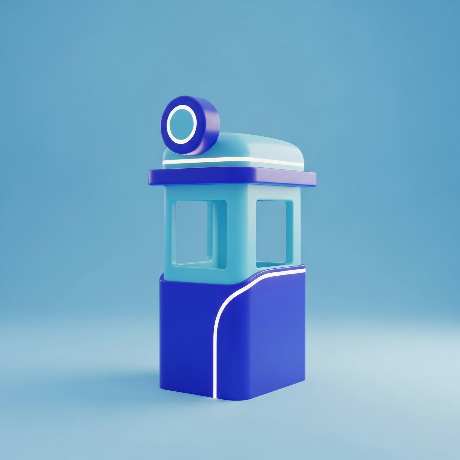 A modern 3D-rendered kiosk in blue and cyan tones with a sleek design, set against a light blue background.