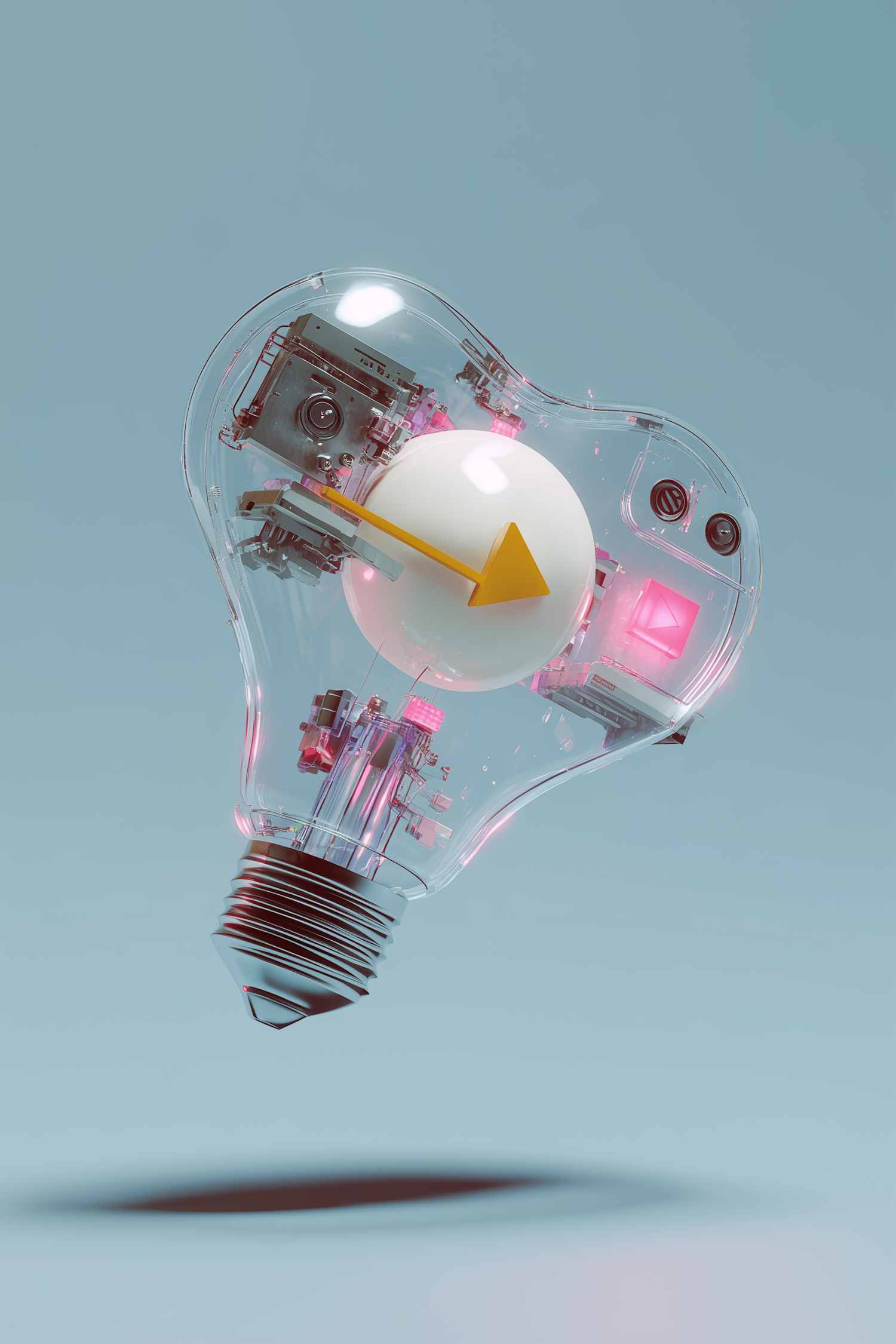 A futuristic light bulb with a transparent shell reveals intricate internal components, glowing pink lights, and a white core with a yellow arrow.