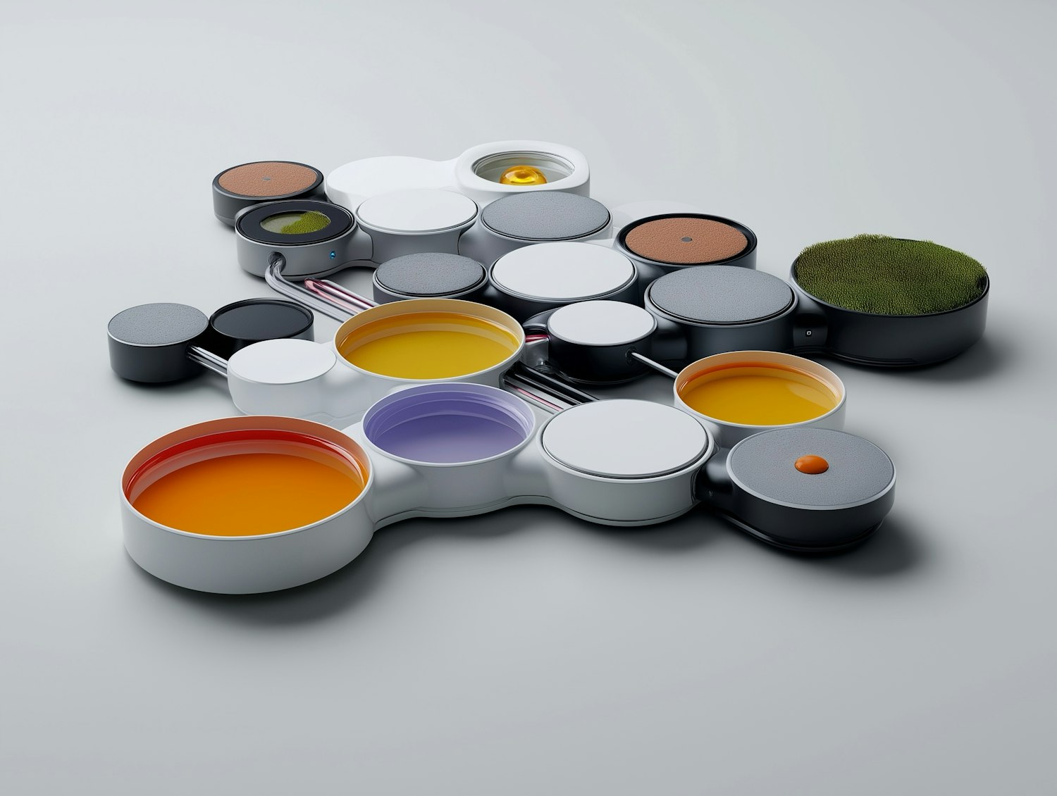 A futuristic arrangement of interconnected circular containers with colorful liquids and textures, set against a sleek gray background.