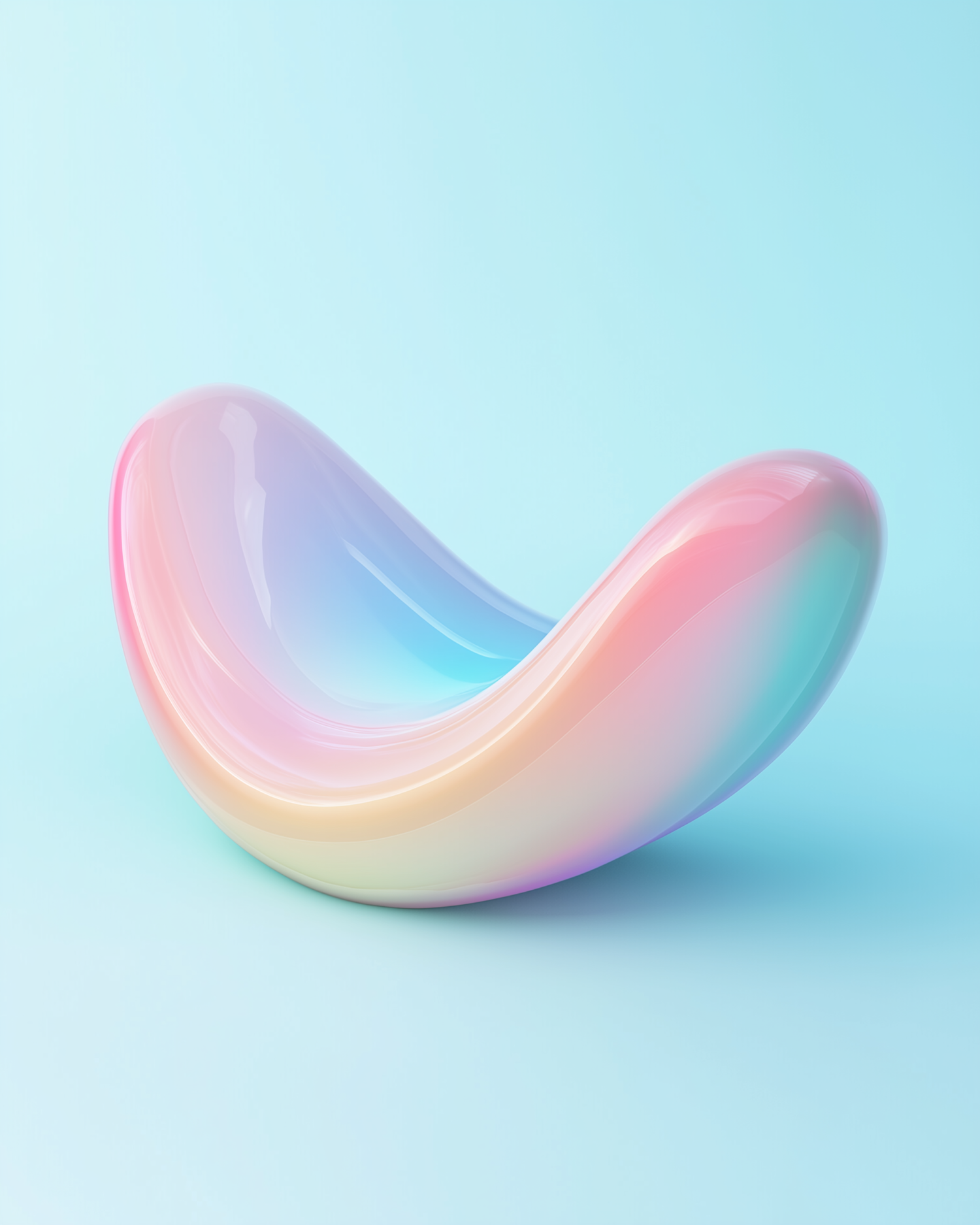 A glossy, pastel-gradient abstract chair with a futuristic design on a light blue background, blending art and minimalism.