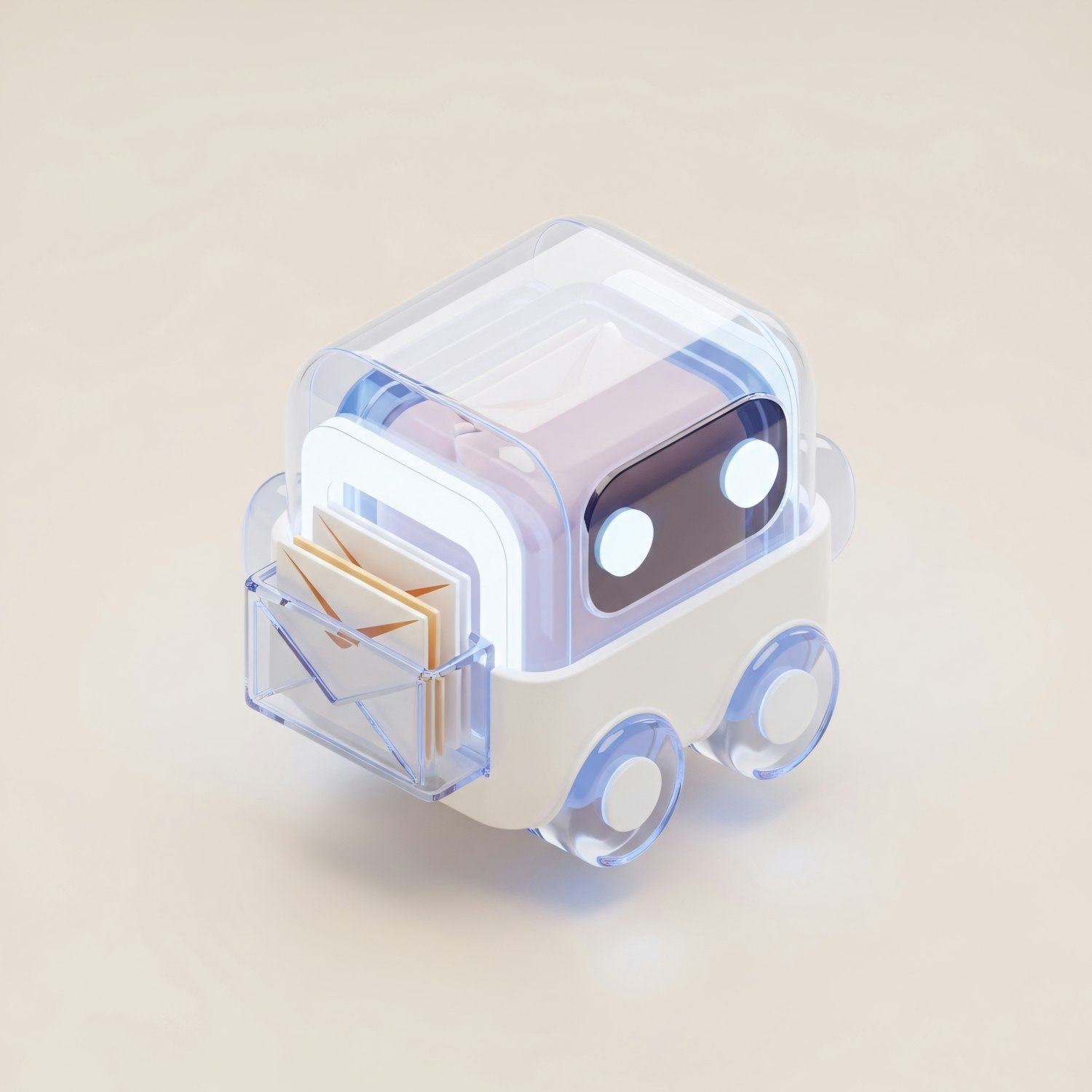 A futuristic 3D-rendered robot designed for mail delivery, featuring a transparent body, glowing eyes, and a compartment holding envelopes.