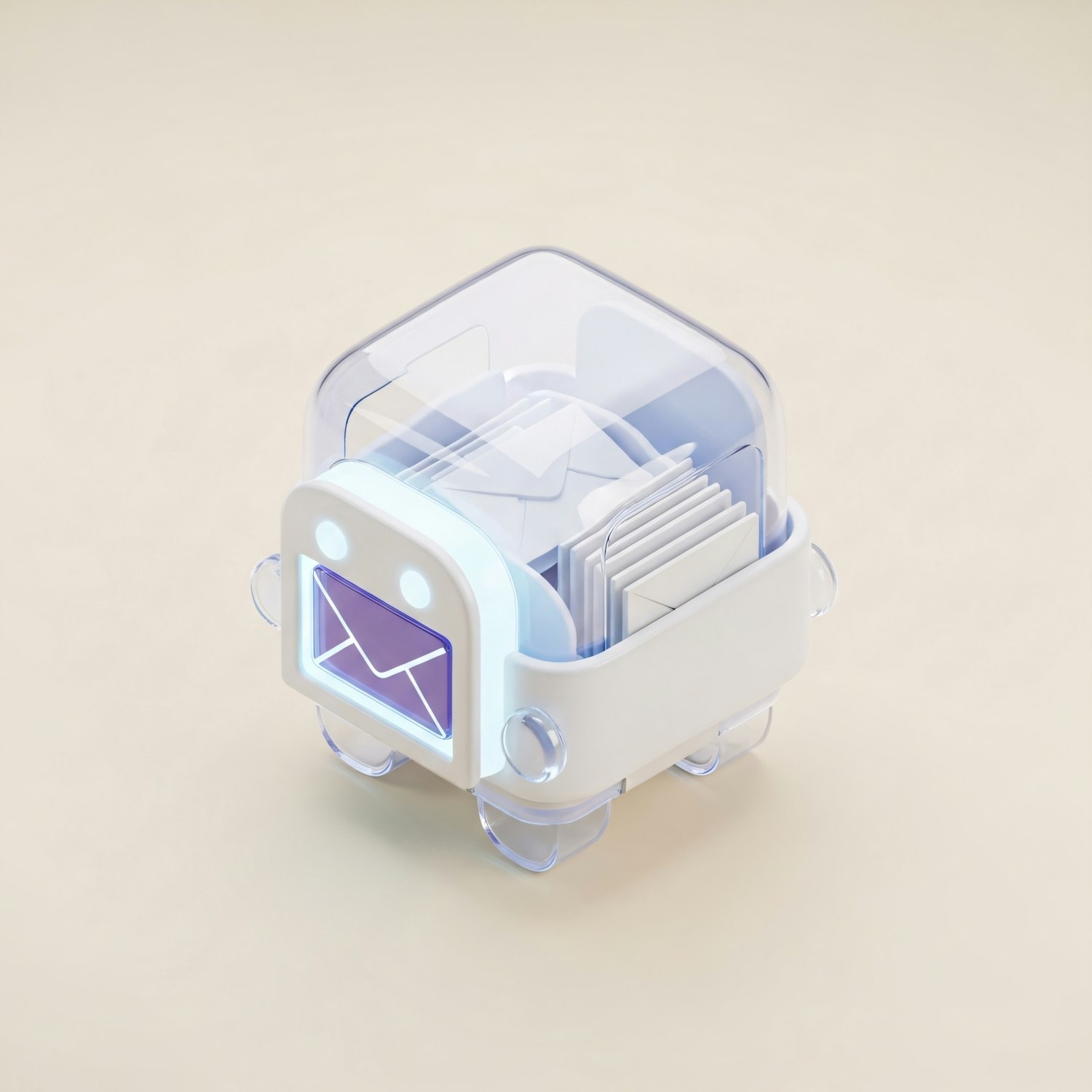 A futuristic 3D-rendered mail delivery robot with a glowing envelope icon and transparent casing, showcasing a modern and sleek design.