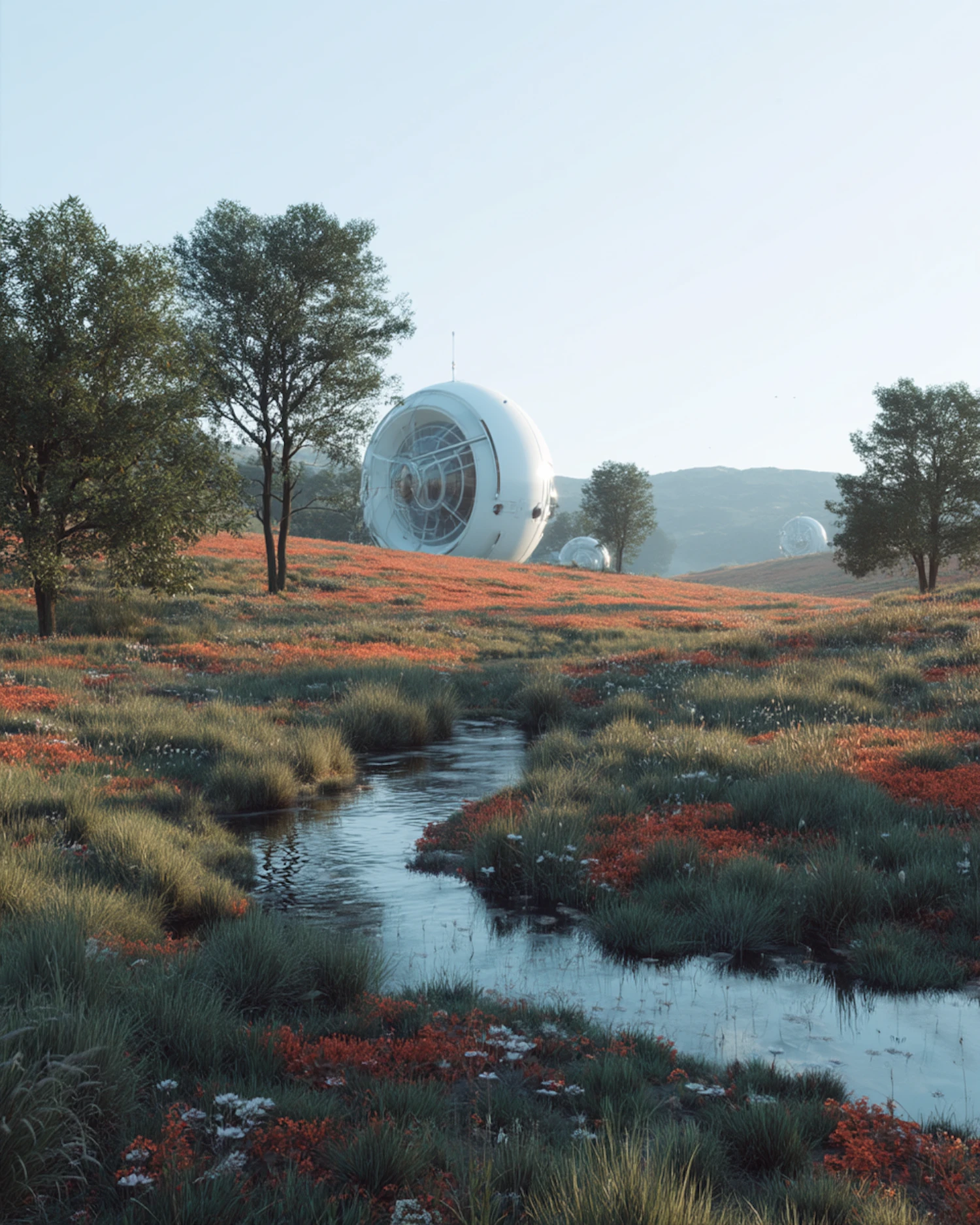 A futuristic meadow with spherical structures, vibrant red flowers, a winding stream, and trees under a clear blue sky.