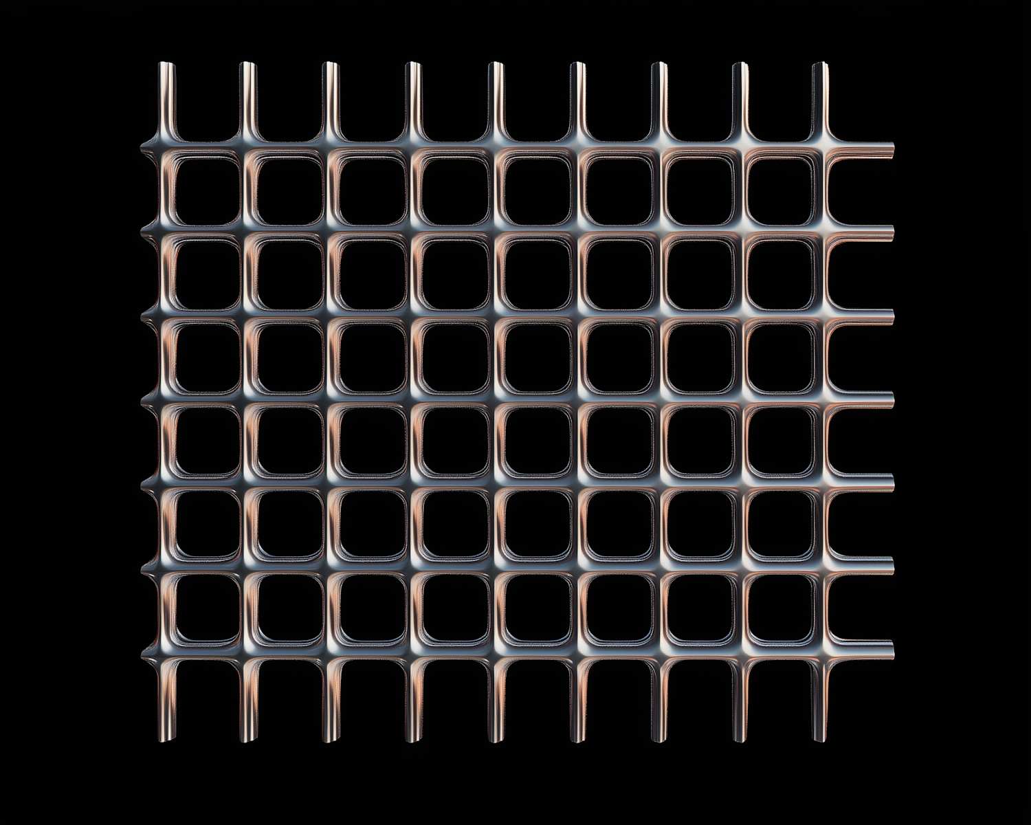 A sleek metallic grid with reflective silver and bronze tones on a black background, showcasing a futuristic and minimalistic design.
