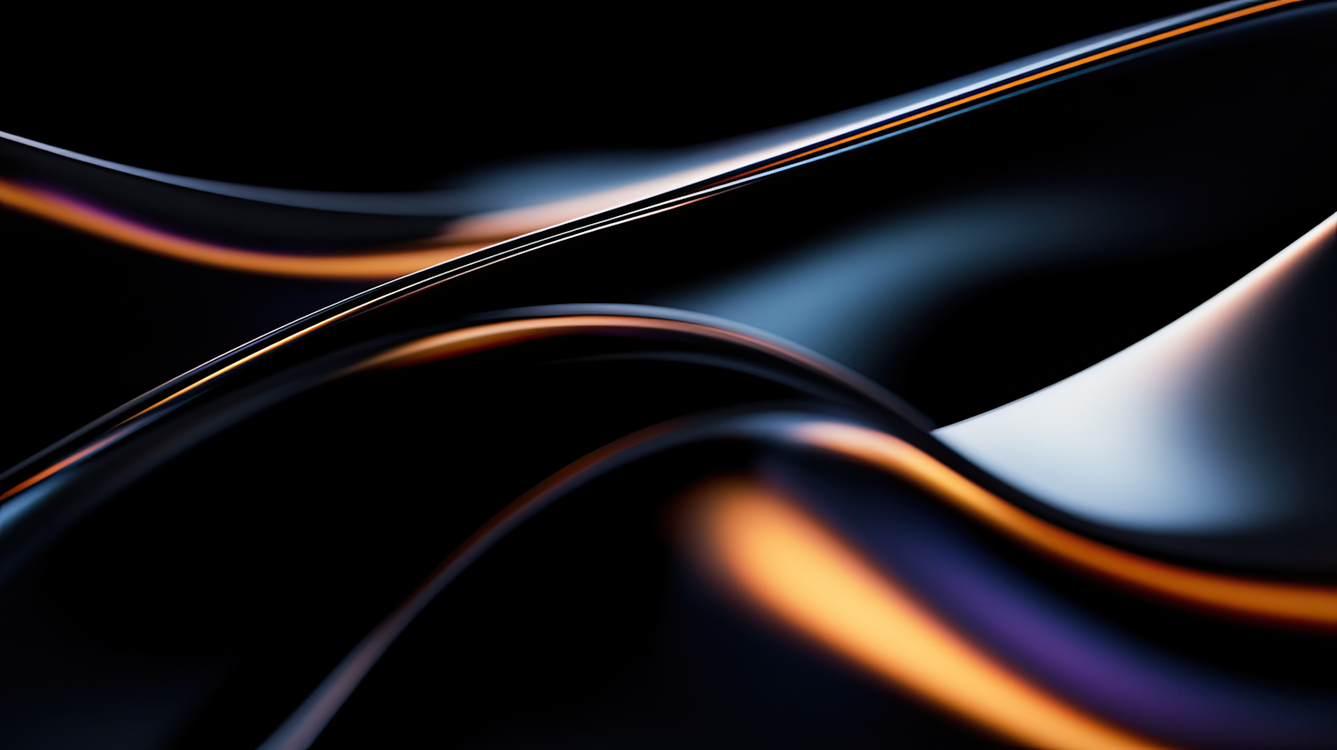 Abstract metallic curves with orange and purple highlights on a black background, creating a sleek and futuristic visual effect.