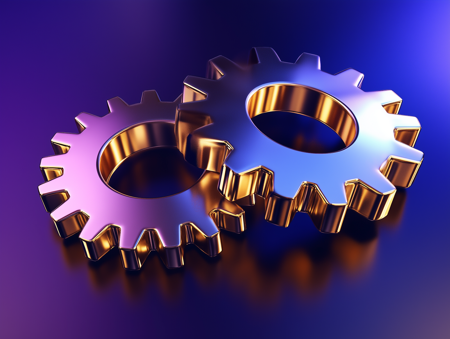 Two interlocked golden metallic gears on a vibrant blue and purple gradient background, symbolizing teamwork and precision.