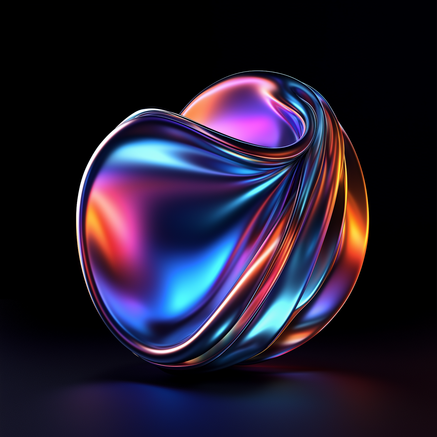 Vibrant 3D abstract sphere with flowing metallic textures in blue, purple, and orange hues against a black background.