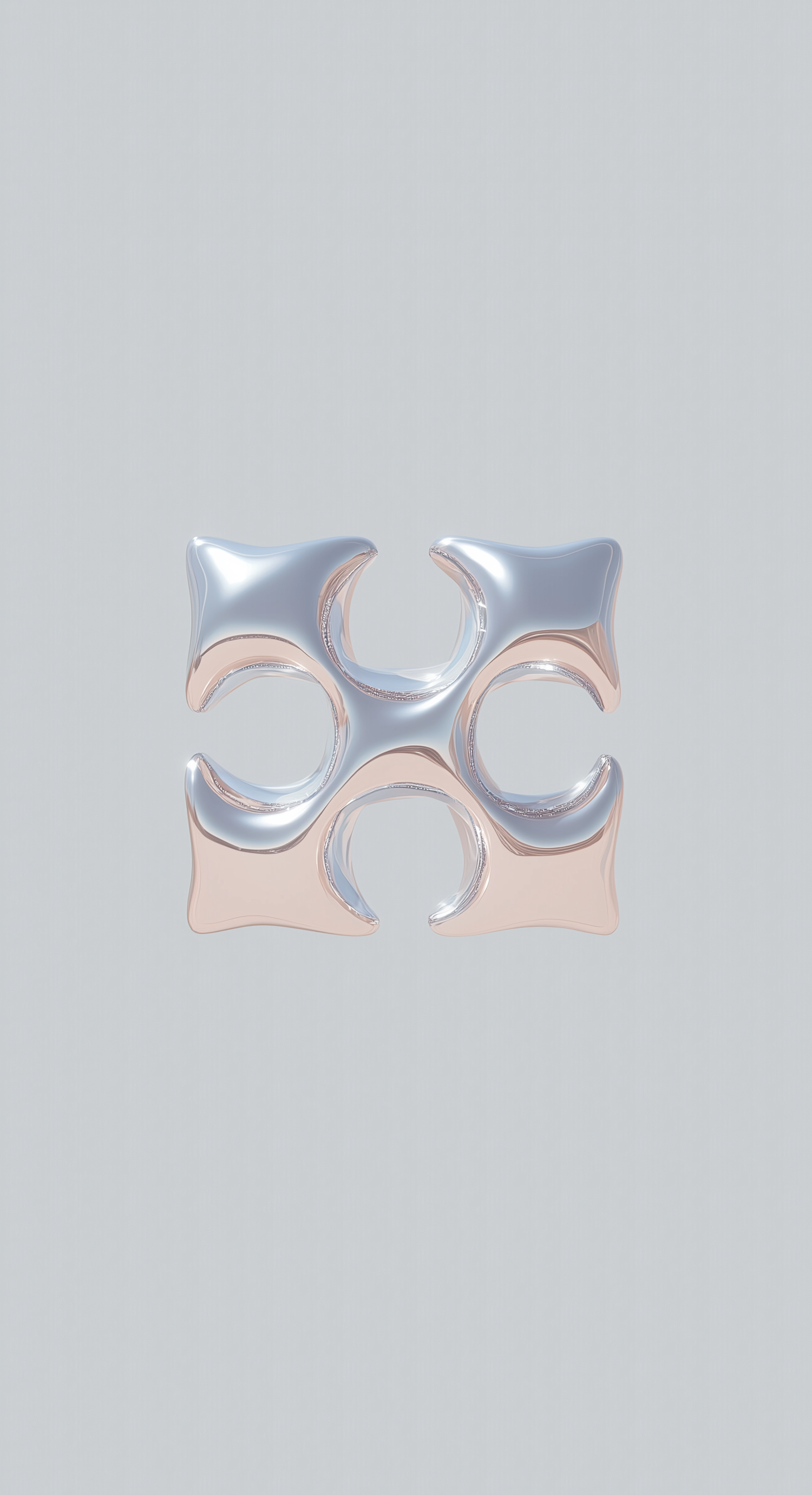 A futuristic metallic 3D design with silver and rose-gold tones, featuring a symmetrical cross-like shape on a light gray background.
