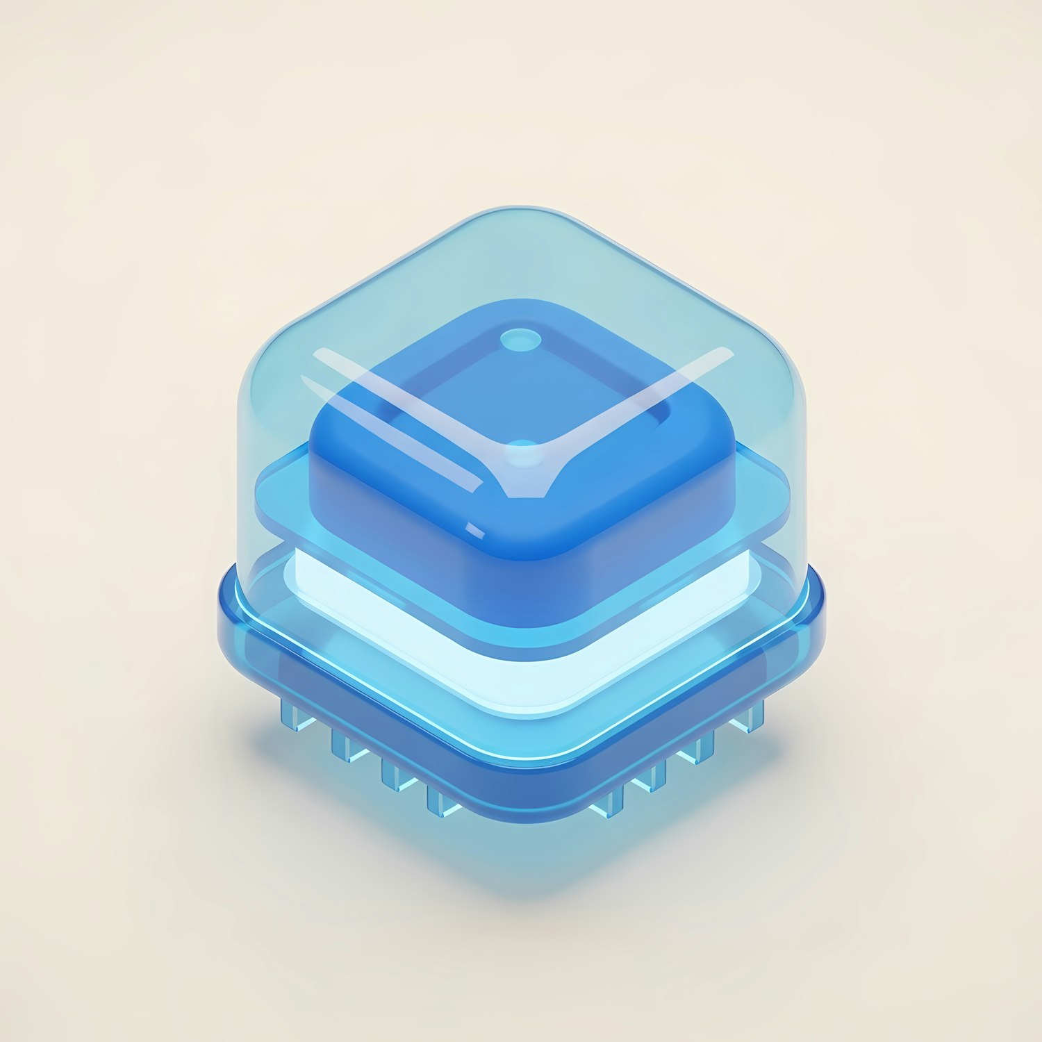 Futuristic 3D-rendered microchip design with a glowing core and translucent blue casing on a neutral background.