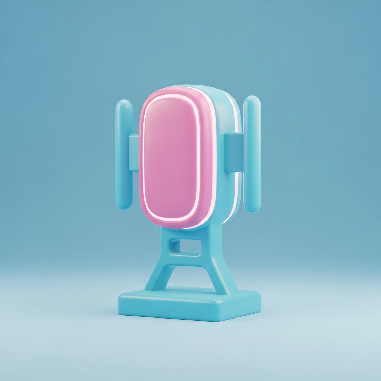 A vibrant 3D-rendered futuristic device with a pink and blue design, glowing accents, and a sleek, modern aesthetic.