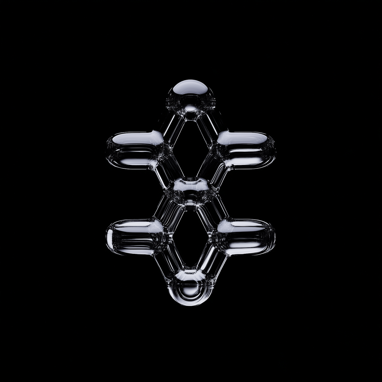 Futuristic 3D molecular-like structure with reflective surfaces on a black background, showcasing a sleek and symmetrical design.