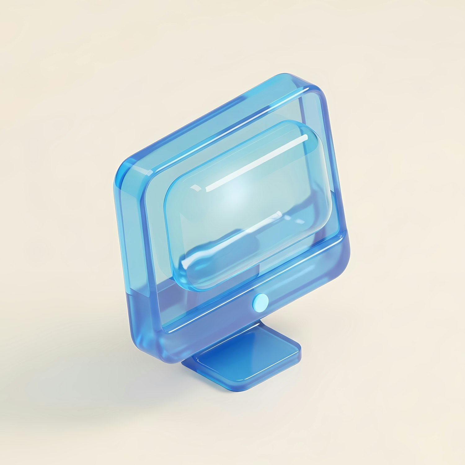 A sleek 3D-rendered translucent blue computer monitor icon on a soft beige background, perfect for modern tech visuals.