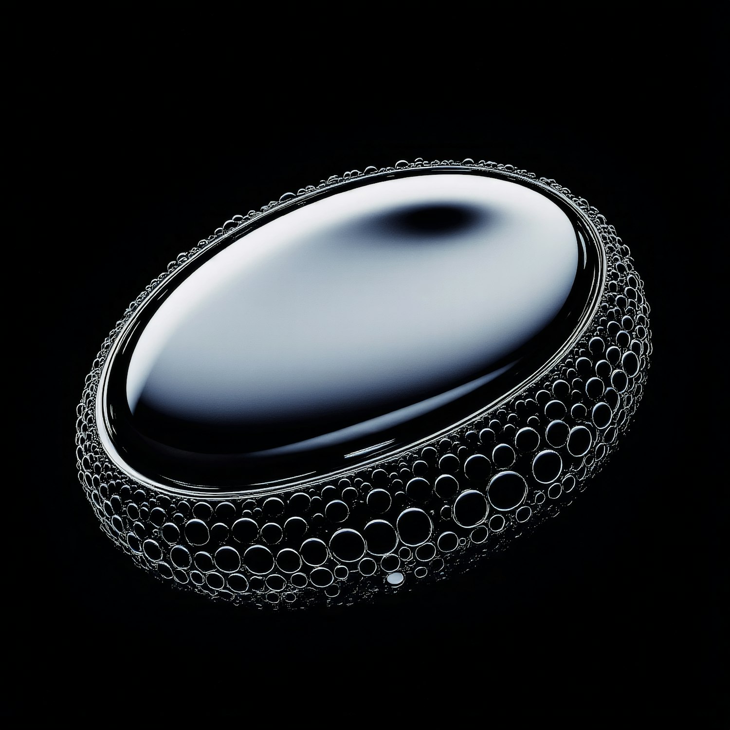 A sleek, glossy oval object surrounded by reflective bubbles on a dark background, creating a modern and futuristic aesthetic.