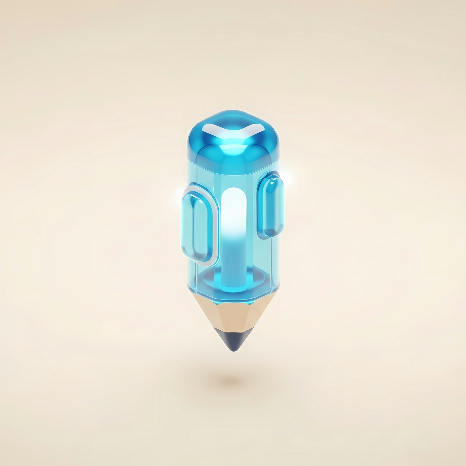 A futuristic 3D pencil design with a transparent blue body and glowing accents, blending modern tech aesthetics with traditional stationery.