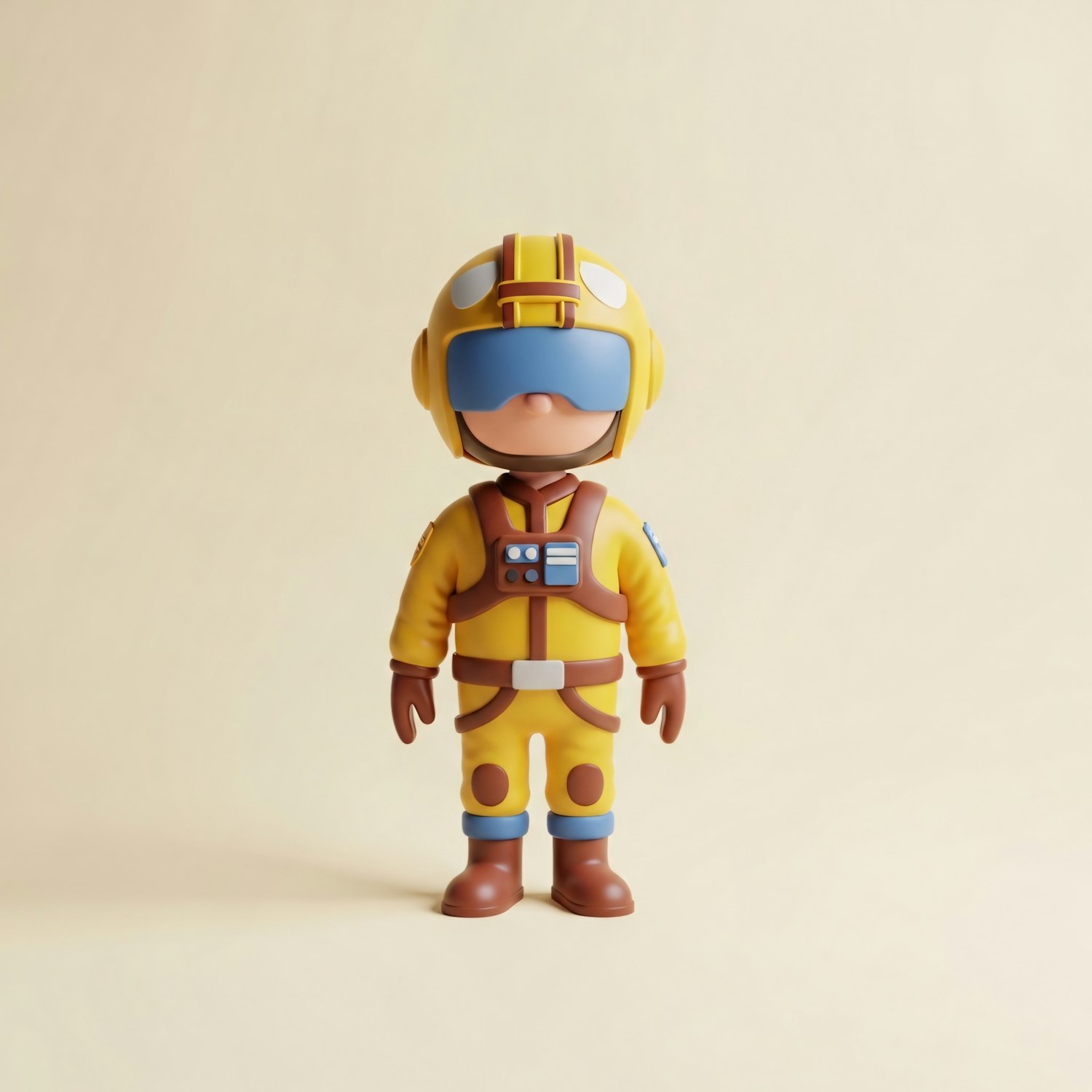 A 3D-rendered cartoon pilot in a yellow suit and helmet with a blue visor, set against a plain beige background.