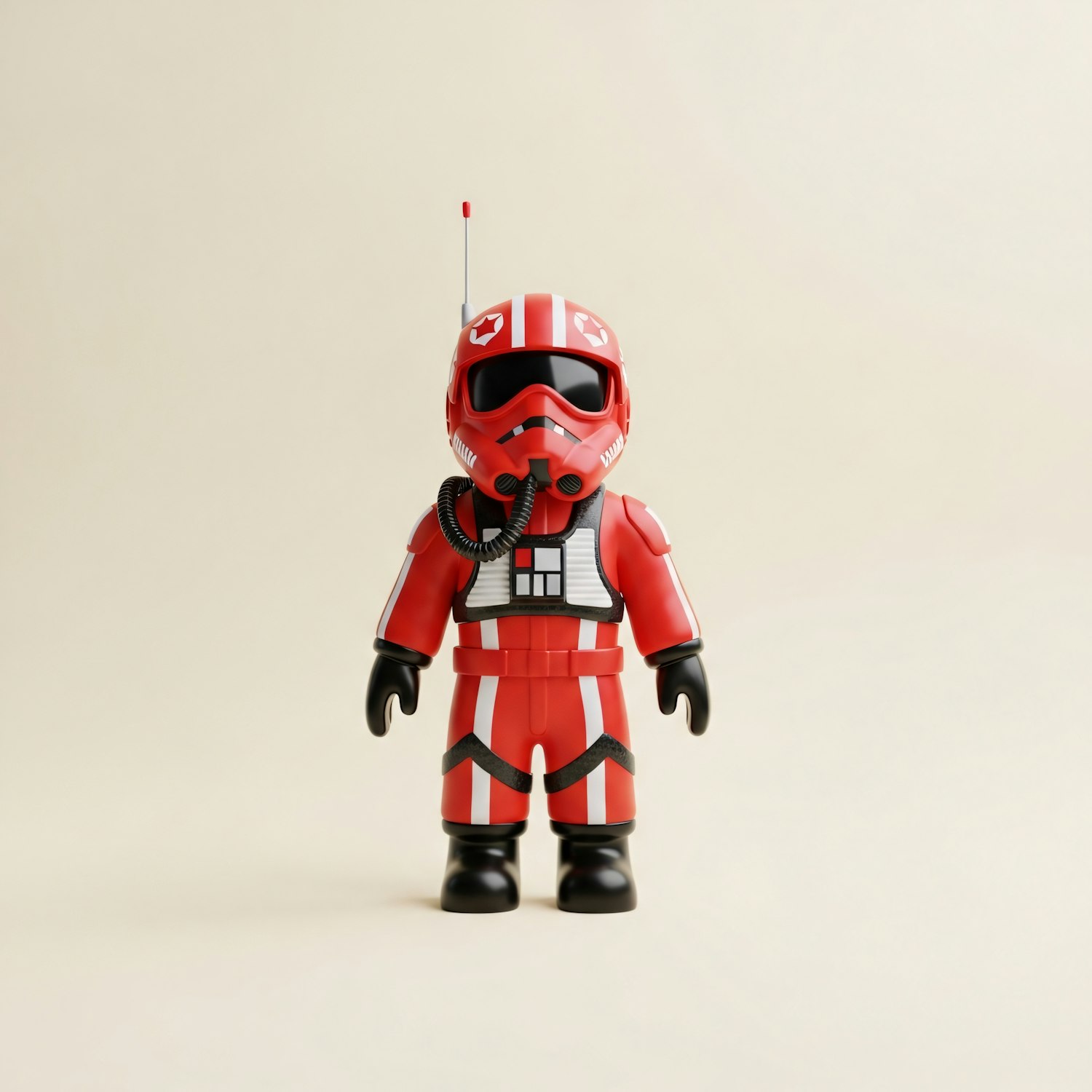 A vibrant red and white toy figure of a futuristic pilot with a helmet and breathing apparatus, set against a neutral background.