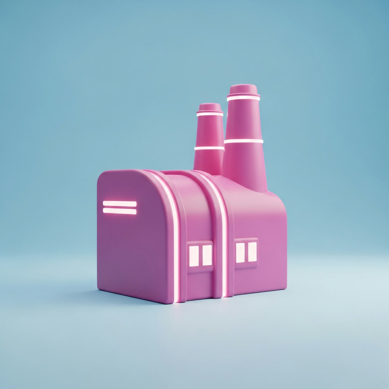 A vibrant 3D model of a pink factory with glowing accents and a clean blue background, showcasing a modern and playful design.