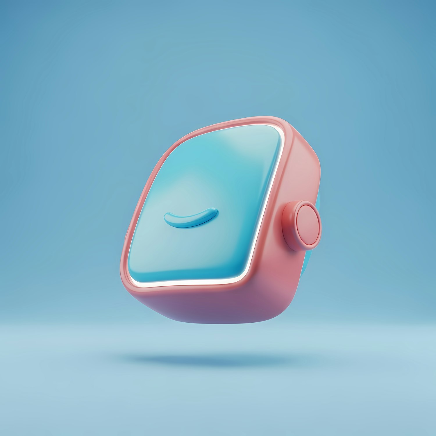 A sleek 3D-rendered gadget with a pink body and blue front panel, floating against a light blue background.