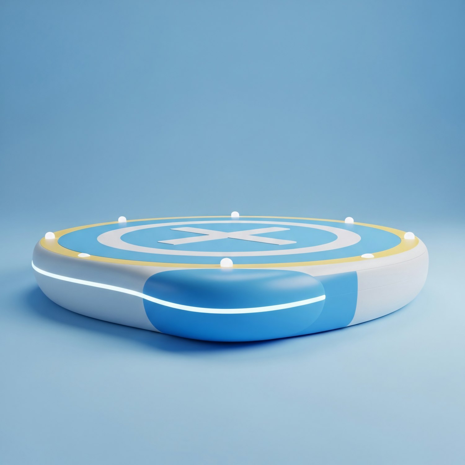 A sleek, futuristic circular platform with glowing accents and a modern design, set against a clean blue background.
