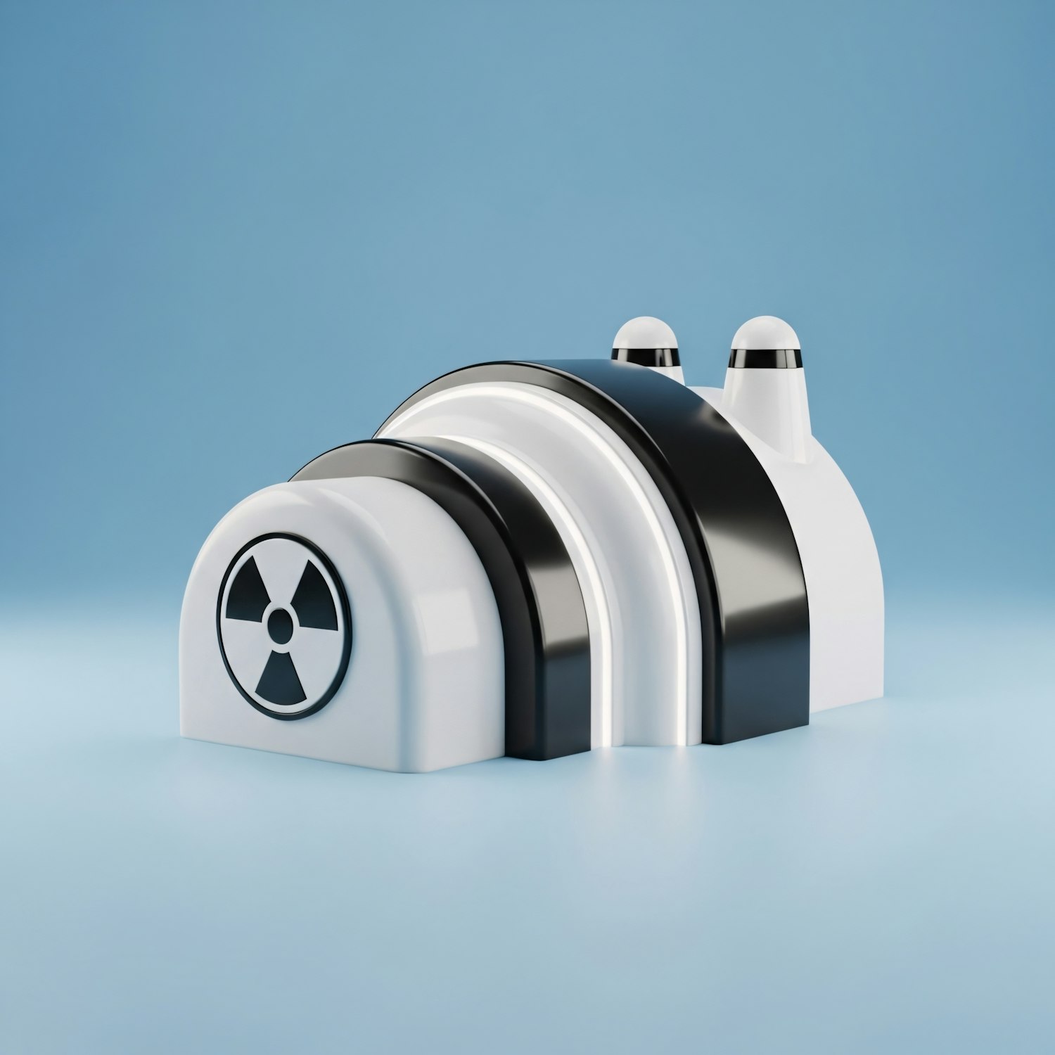 A sleek 3D model of a nuclear power plant with a modern design, featuring a radiation symbol and a clean blue background.