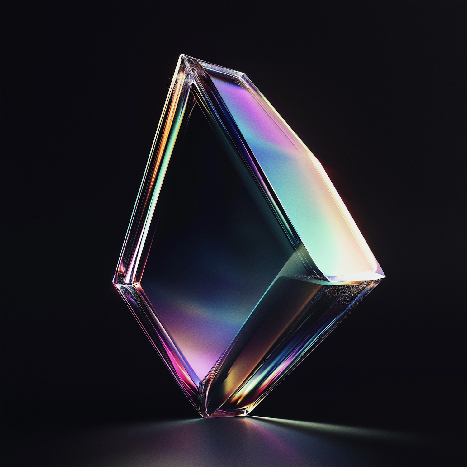 A futuristic 3D-rendered prism with vibrant light refractions against a dark background, creating a glowing, ethereal effect.