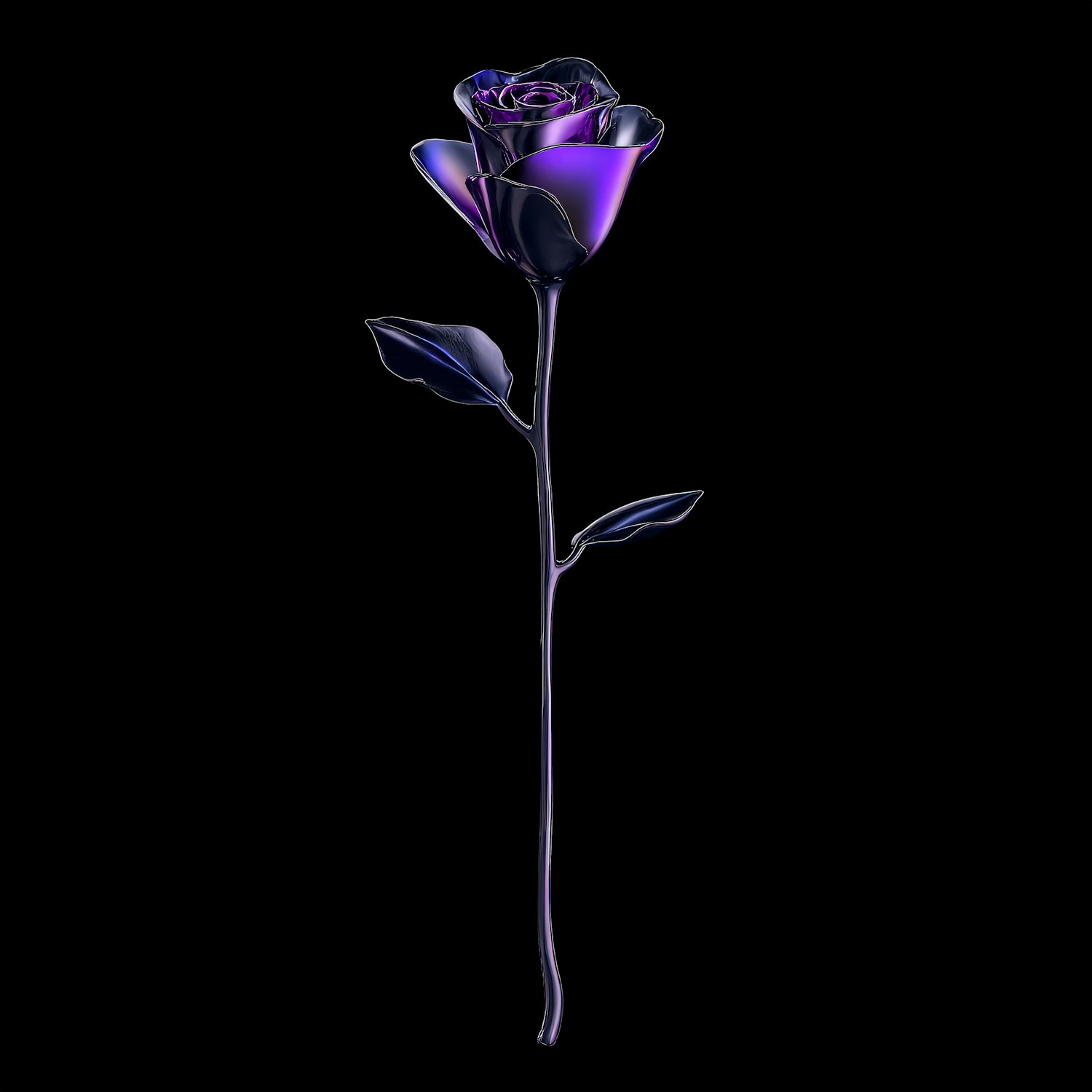 A stunning digital rendering of a metallic purple rose on a black background, showcasing its glossy texture and vibrant hues.