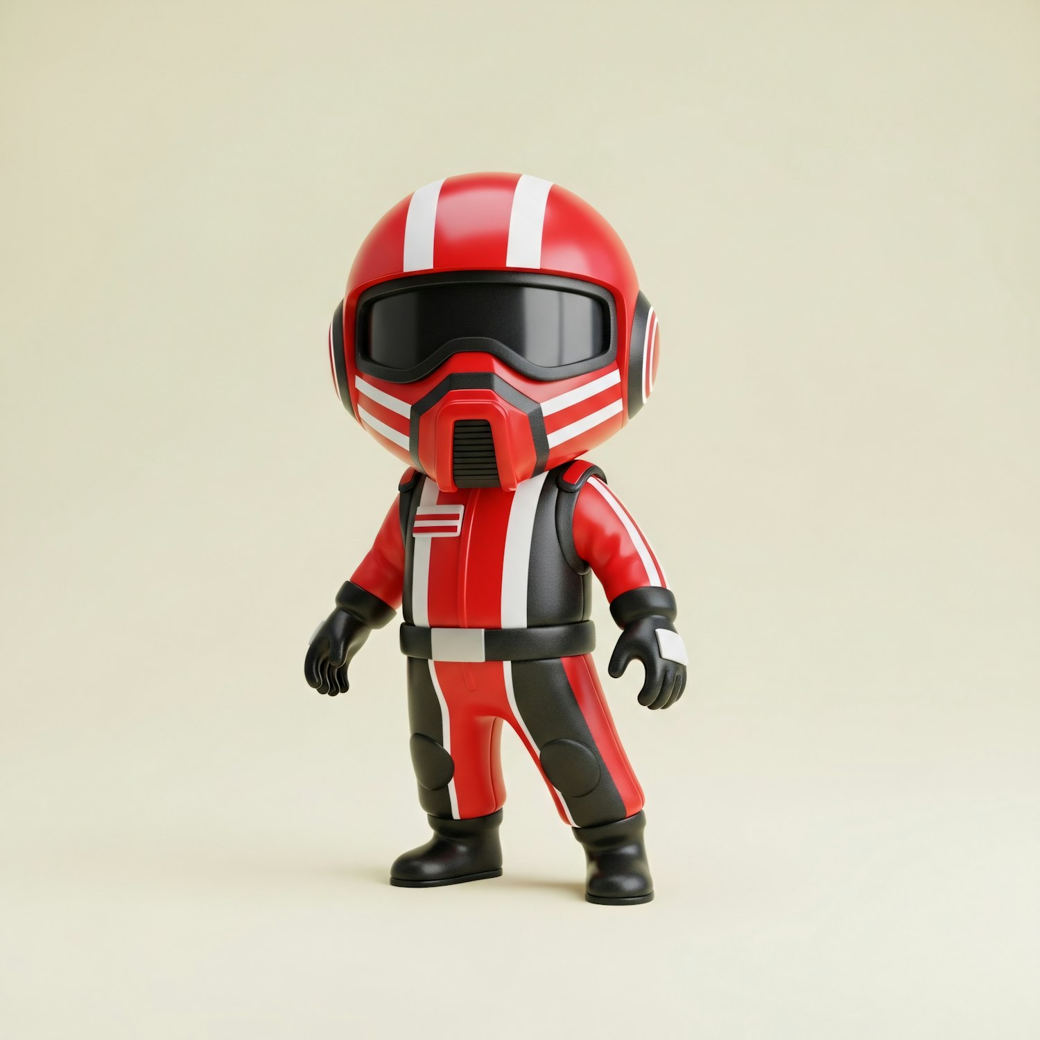A stylized figure in a red and black futuristic suit with a helmet, featuring bold colors and a cartoonish design against a neutral background.