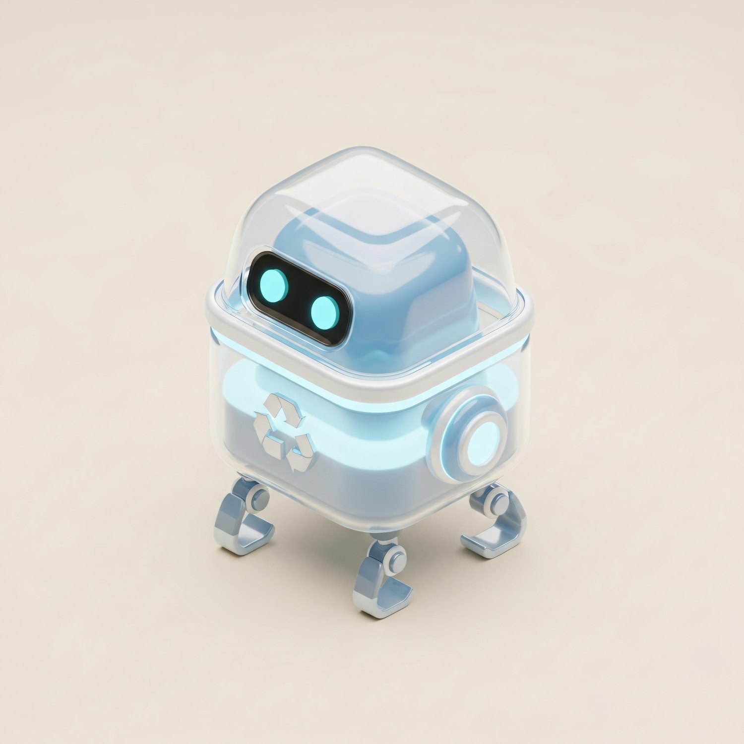 A cute, futuristic robot with glowing blue eyes and a transparent dome, designed with a recycling theme and a sleek, minimalistic look.