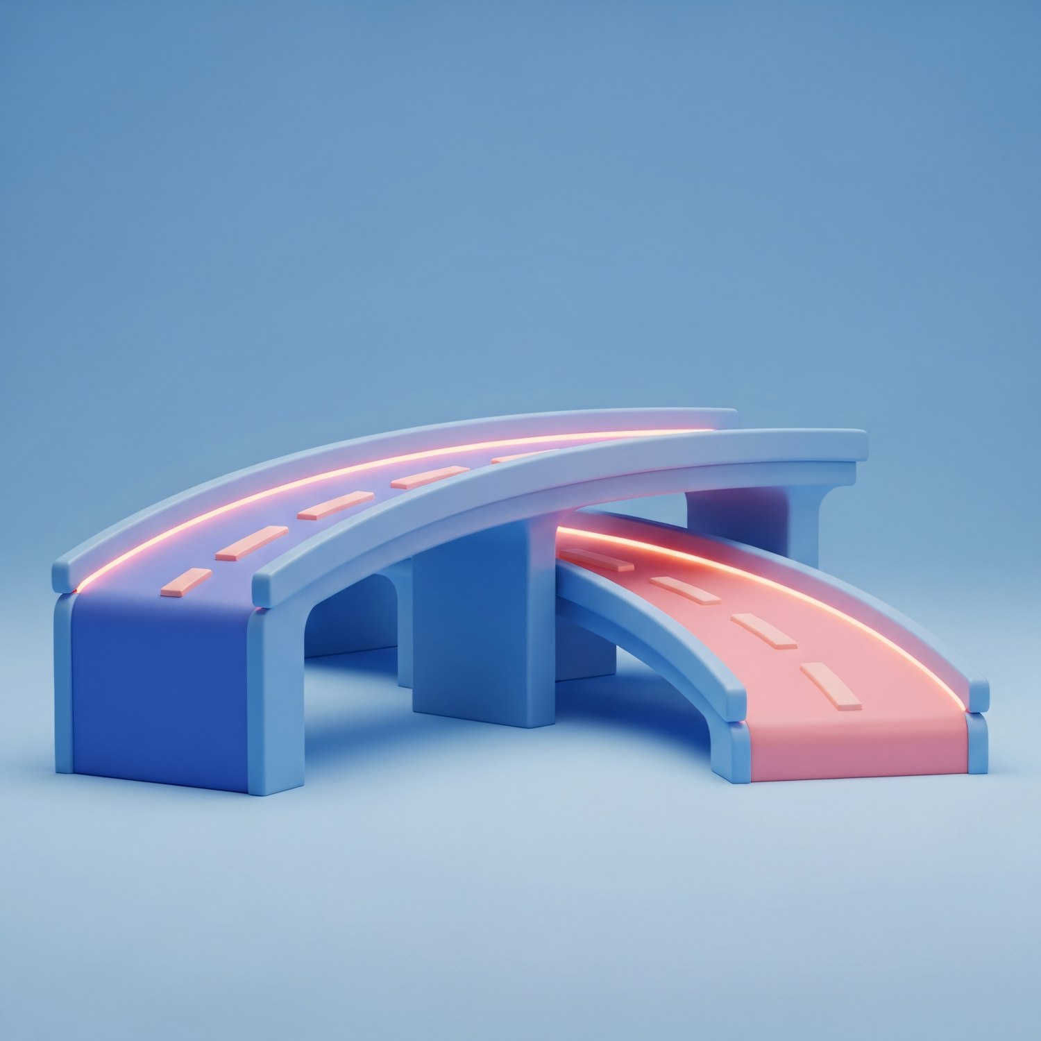 A modern, minimalistic design of intersecting pastel-colored roads with glowing neon accents, set against a clean blue background.