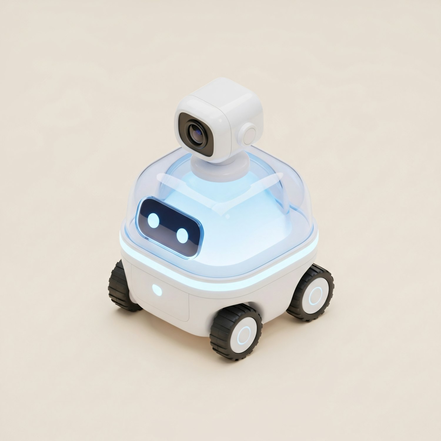 A sleek, modern robot with a friendly design, featuring a camera sensor, glowing eyes, and four wheels, set against a neutral background.
