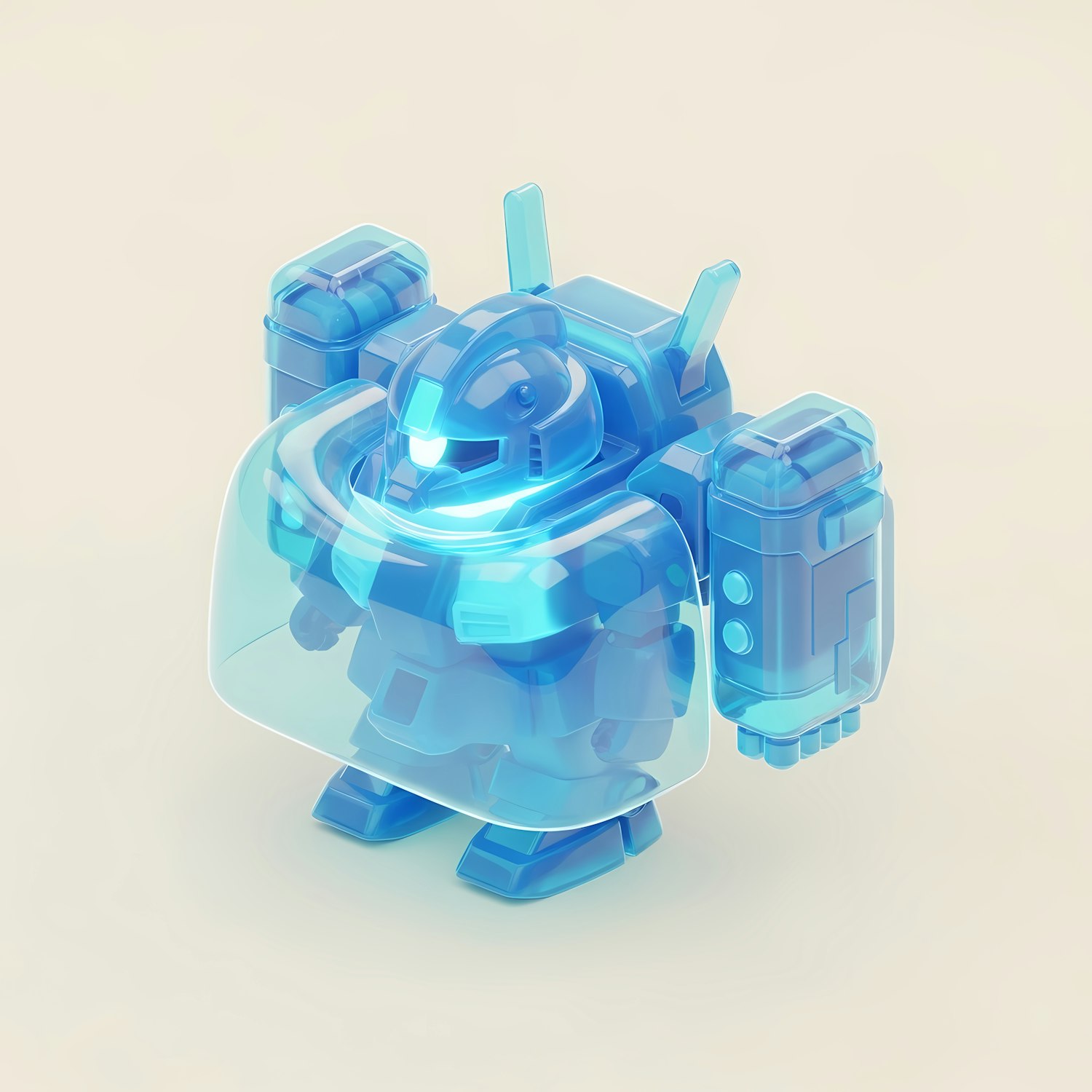 A futuristic 3D-rendered robot with a transparent blue body and glowing accents, set against a neutral beige background.