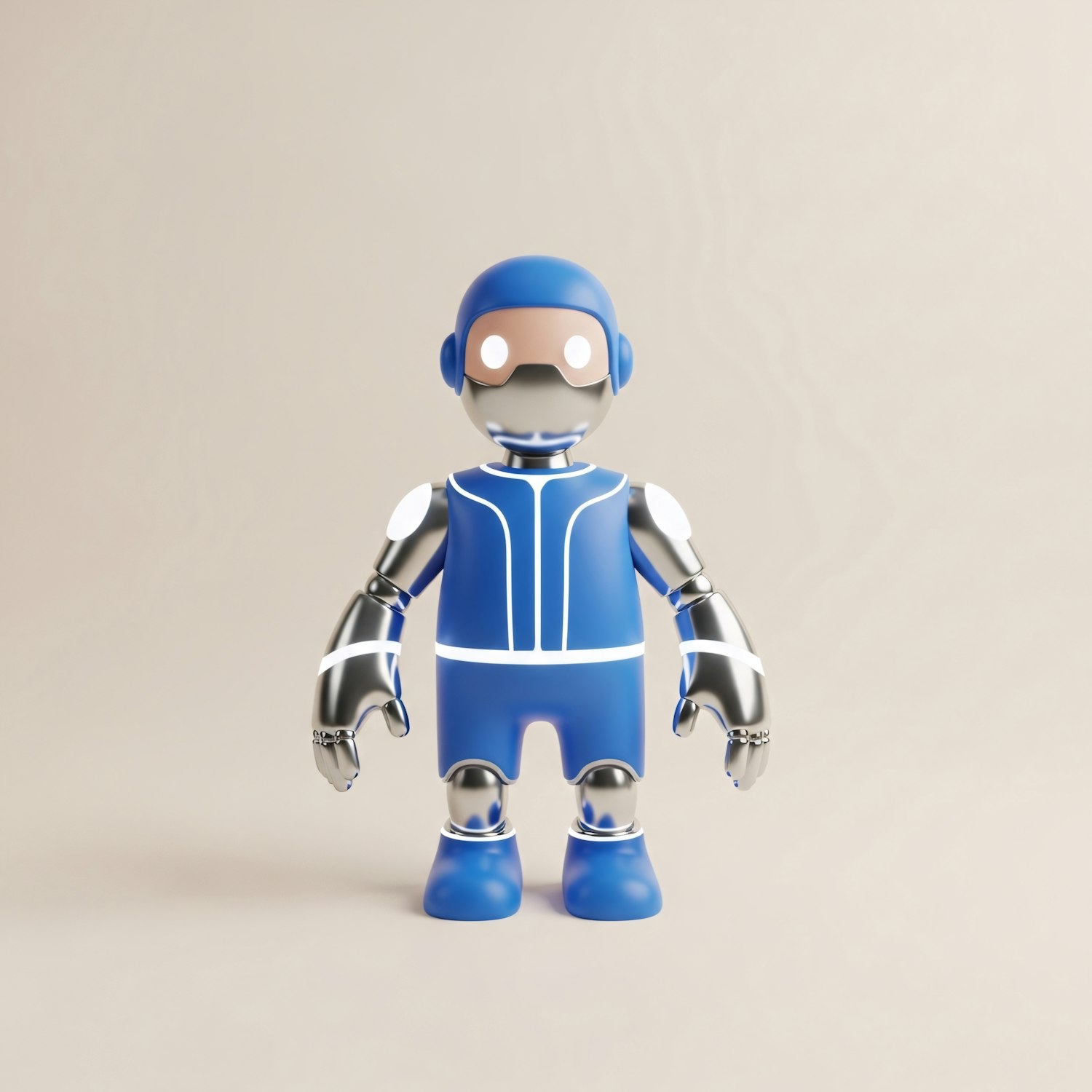 A futuristic 3D-rendered robot with a blue and silver design, glowing accents, and a sleek, modern aesthetic on a neutral background.
