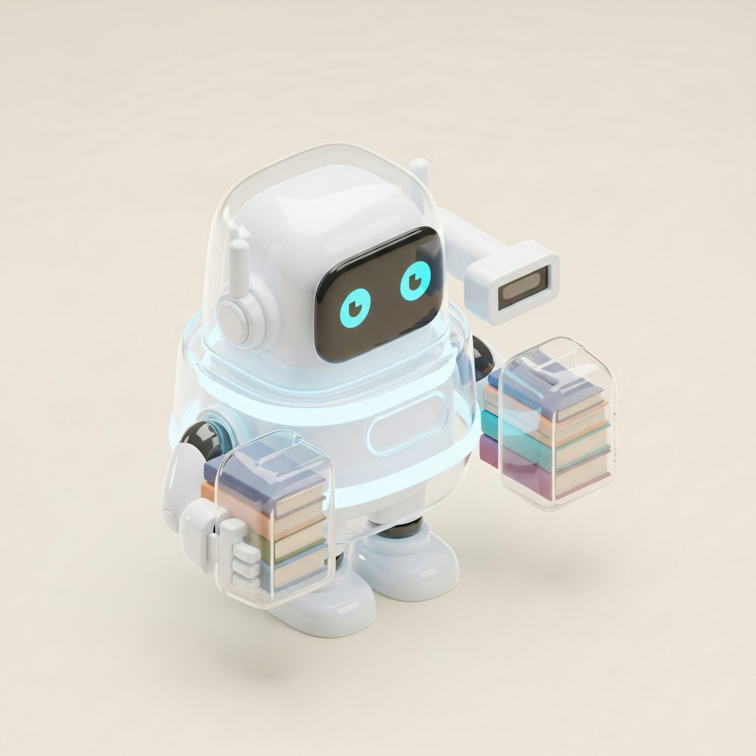 A cute 3D robot with glowing blue eyes holds books in transparent containers, symbolizing knowledge and technology.