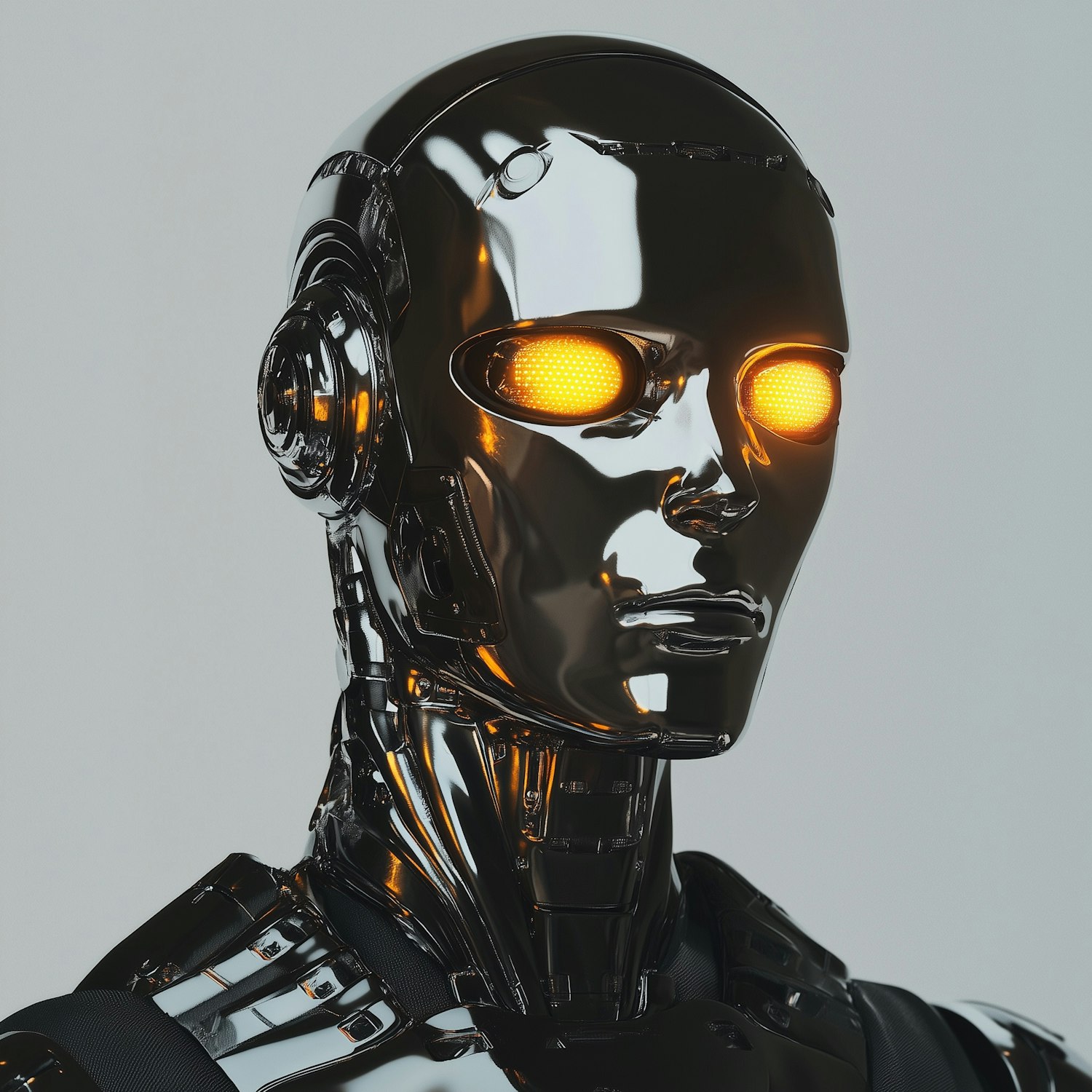 Futuristic humanoid robot with glowing orange eyes and a sleek metallic black design, set against a neutral gray background.