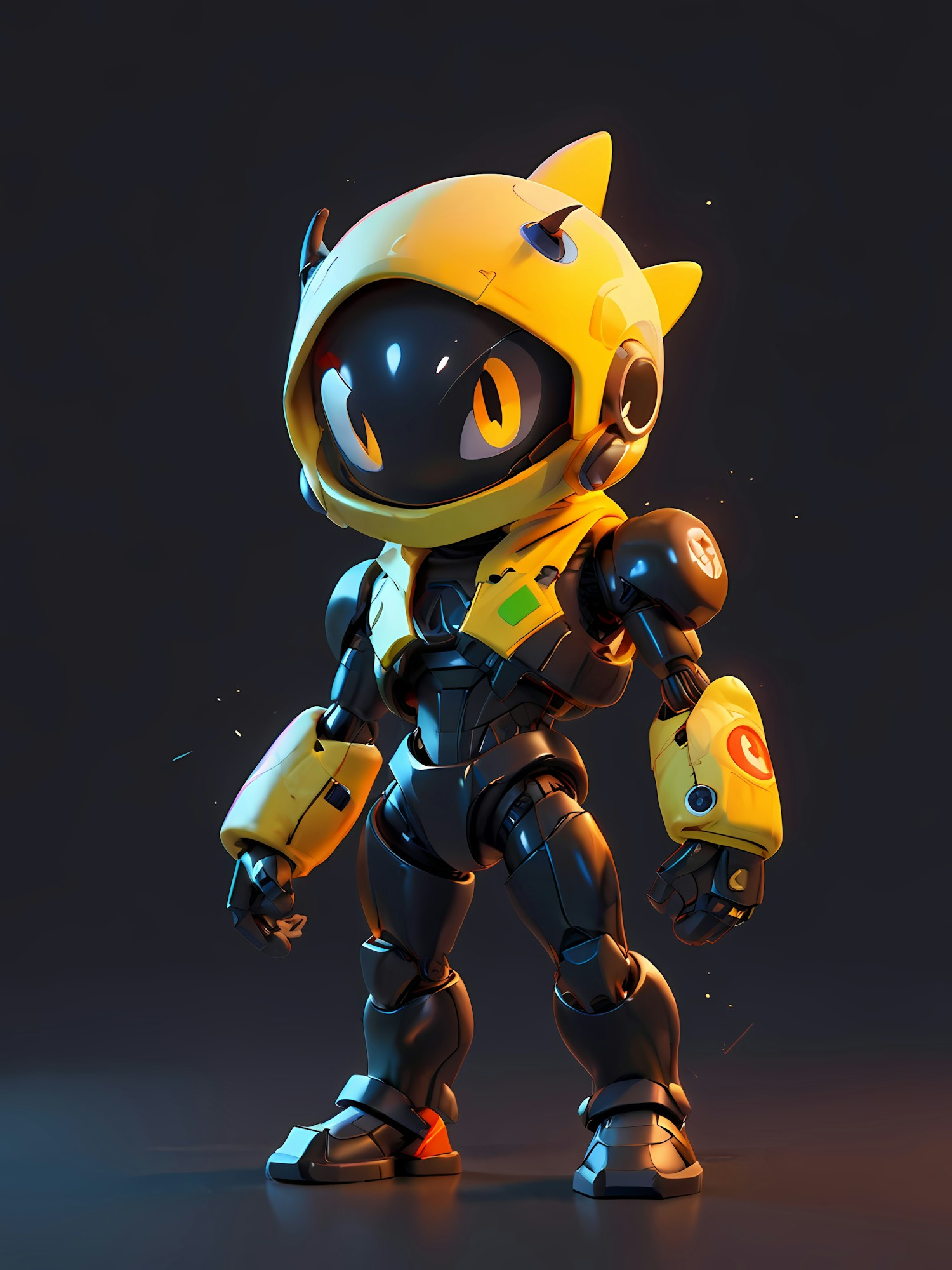 A sleek robot with cat-like ears, glowing yellow eyes, and a futuristic design stands confidently against a dark background.