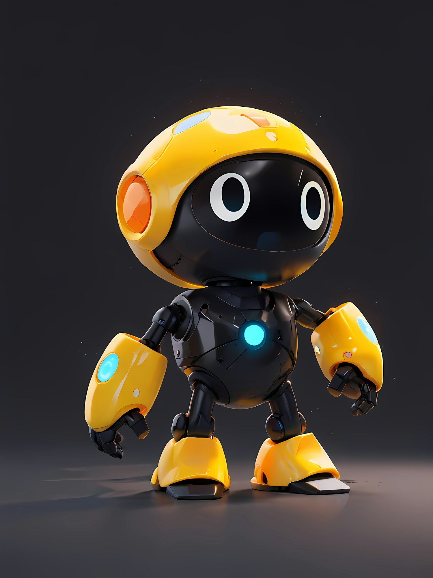 Adorable 3D robot with yellow accents, glowing blue chest light, and expressive eyes. Perfect mix of futuristic and playful design.