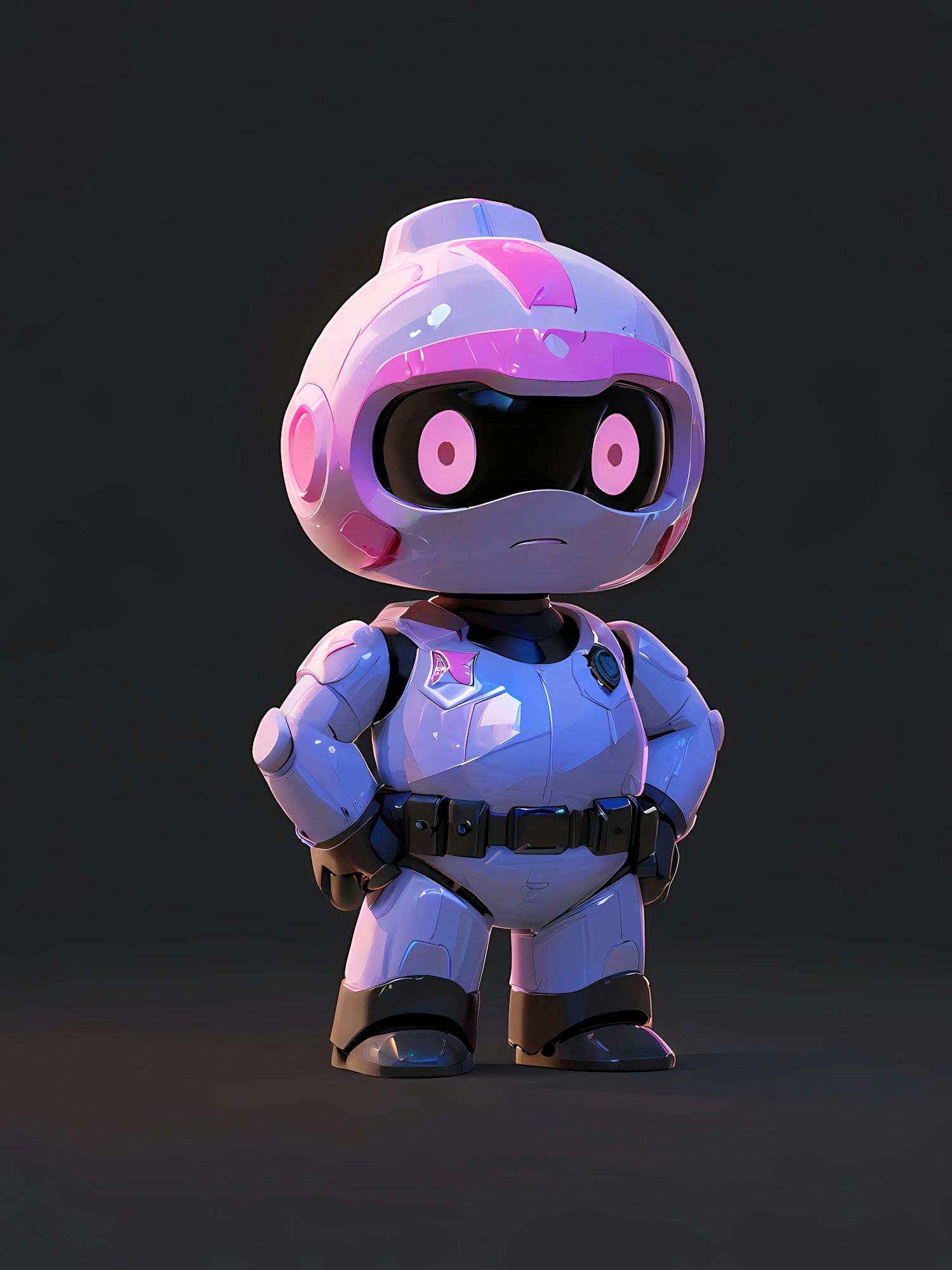 Adorable 3D robot with pink and white armor, expressive eyes, and a confident pose. Perfect for futuristic or sci-fi themes.