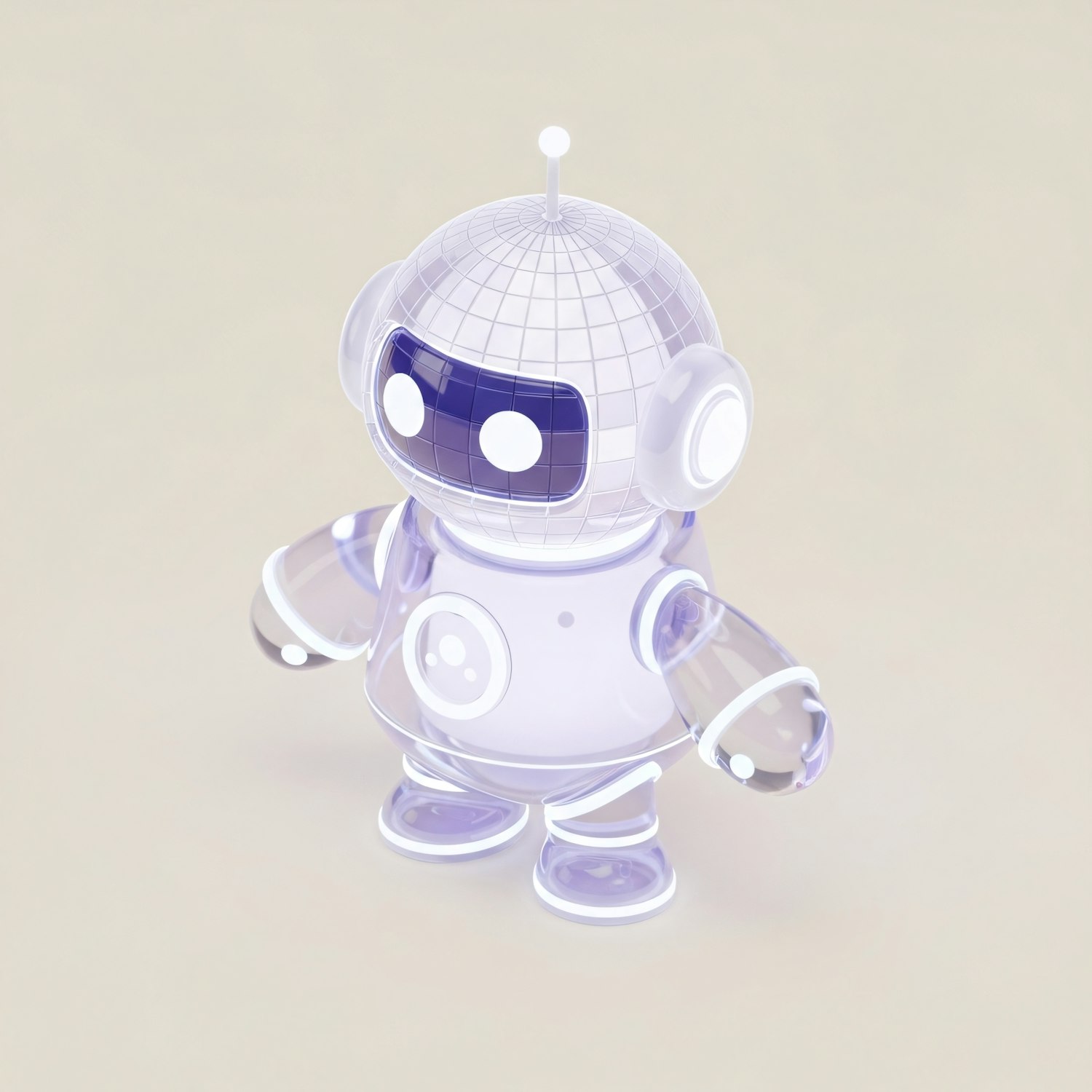 A futuristic 3D-rendered robot with a glowing, transparent design and a soft lavender color scheme, standing against a neutral background.
