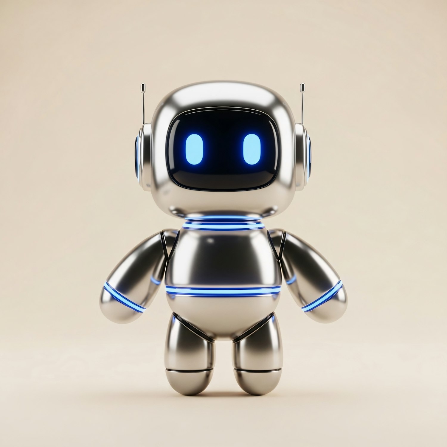 A sleek, metallic robot with glowing blue accents and a friendly design, standing against a neutral background.